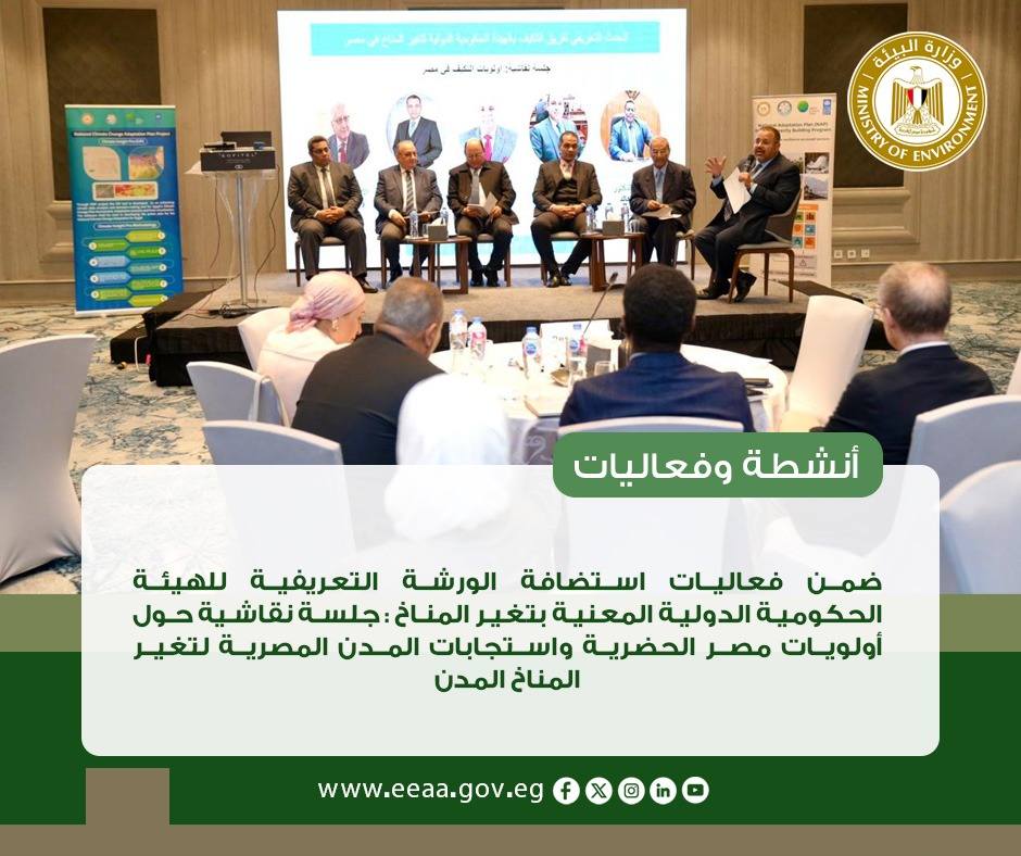 تحت رعاية الدكتورة منال عوض وزيرة التنمية المحلية والقائم بأعمال وزير البيئة، وضمن فعاليات الورشة التعريفية للهيئة الحكومية الدولية لتغير المناخ والتكيف والمخاطر ، الذي تنظمه وزارة البيئة من خلال مشروع إعداد الخطة الوطنية للتكيف في مصر بتمويل من برنامج الأمم المتحدة الإنمائي UNDP وصندوق اللمناخ الأخضر GCF، تم تنظيم جلسة نقاشية حول أولويات مصر الحضرية واستجابات المدن المصرية لتغير المناخ المدن.