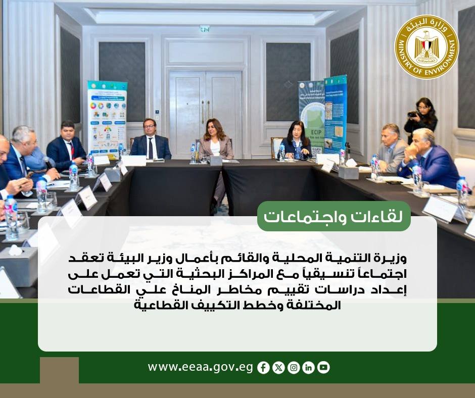 وزيرة التنمية المحلية والقائم بأعمال وزير البيئة تعقد اجتماعاً تنسيقياً مع المراكز البحثية التي تعمل على إعداد دراسات تقييم مخاطر المناخ علي القطاعات المختلفة وخطط التكييف القطاعية، وتؤكد أنه لا سياسة مناخية فعّالة دون أساس علمي رصين، مشيرة إلى مضى مصر قدمًا في إعداد الخطة الوطنية للتكيف مستهدفة الانتقال من مرحلة تشخيص المخاطر إلى مرحلة حلول التكيف القابلة للتنفيذ.