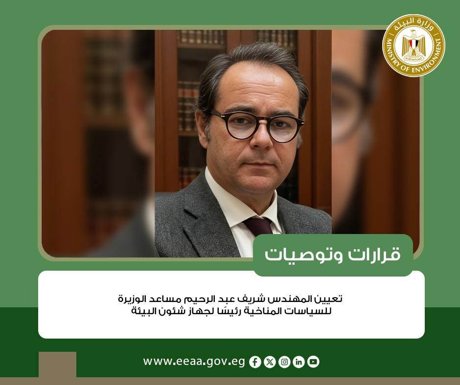 أصدر الدكتور مصطفى مدبولى رئيس مجلس الوزراء، وبناء على عرض الوزير المختص قرارا بتعيين المهندس شريف عبد الرحيم مساعد الوزيرة للسياسات المناخية رئيسًا لجهاز شئون البيئة لمدة عام، والدكتورة منال عوض، تتقدم بالشكر والتقدير للأستاذ علي أبو سنة على ما بذله من جهود خلال فترة توليه قائم بأعمال رئيس جهاز شئون البيئة، كما تعرب عن خالص التمنيات بالتوفيق للمهندس شريف عبد الرحيم في مهام عمله الجديدة، مؤكدة ثقتها في قدرته على قيادة جهاز شئون البيئة خلال المرحلة المقبلة بما يمتلكه من كفاءة وخبرات متراكمة ورؤية متخصصة في ملفات البيئة والتغيرات المناخية.