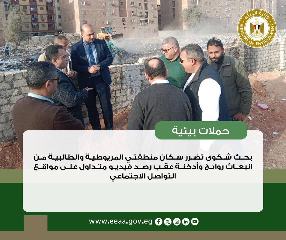 الدكتورة منال عوض تكلف جهاز تنظيم إدارة المخلفات ببحث شكوى تضرر سكان منطقتي المريوطية والطالبية من انبعاث روائح وأدخنة عقب رصد فيديو متداول على مواقع التواصل الاجتماعي، وتشدد على اتخاذ كافة الإجراءات اللازمة للحد من اندلاع أي حرائق أو اشتعالات بمواقع التجمعات العشوائية للمخلفات الصلبة.