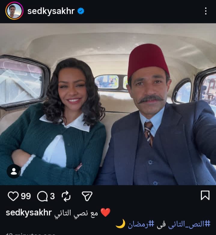 ونشر صدقي صخر صورة له مع الفنانة أسماء أبو اليزيد من كواليس التصوير، وذلك عبر حسابها الرسمي بموقع التواصل الاجتماعي “انستجرام”، وعلق عليها قائلا: مع نصي التاني.