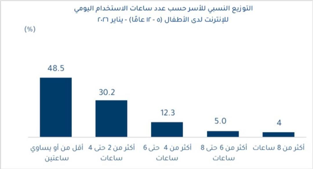 ووفقًا للمؤشر أشارت 48.5% من الأسر إلى أن أطفالهم (5- 12 عامًا) يقضون أقل من ساعتين يوميًا على الإنترنت، في حين أفادت 30.2% من الأسر أن أطفالهم يقضون أكثر من ساعتين وحتى 4 ساعات يوميًا، وفي المقابل بلغت نسبة الأسر التي أفادت أن أطفالها يستخدمون الإنترنت لأكثر من 8 ساعات يوميًا نحو 4%، واتصالًا يميل الأطفال (5-12 عامًا) إلى استخدام الإنترنت بشكل أكبر لأغراض الترفيه والألعاب، حيث تمثل هذه الأنشطة نحو 42.3% من إجمالي متوسط الساعات التي يقضيها الأطفال يوميًا على الإنترنت، مقارنًة بالاستخدامات التعليمية التي تشكل 33.3% أو التثقيفية بنسبة 24.4%، ويعكس هذا التوجه هيمنة البعد الترفيهي على سلوك الأطفال الرقمي.