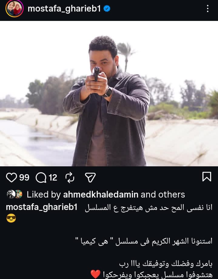 ونشر مصطفى غريب صورة له، وهو حامل لسلاح، وذلك عبر حسابه الرسمي بموقع التواصل الاجتماعي “انستجرام”، وعلق عليها قائلا: أنا نفسي ألمح حد مش هيتفرج على المسلسل، استنونا في الشهر الكريم في مسلسل هي كيميا، بأمرك وفضلك وتوفيقك يا رب، هتشوفوا مسلسل يعجبكوا ويفرحكوا.
