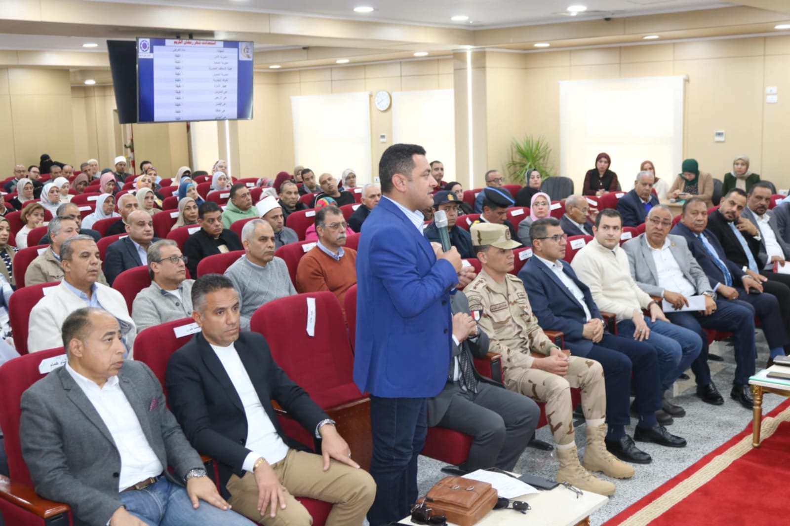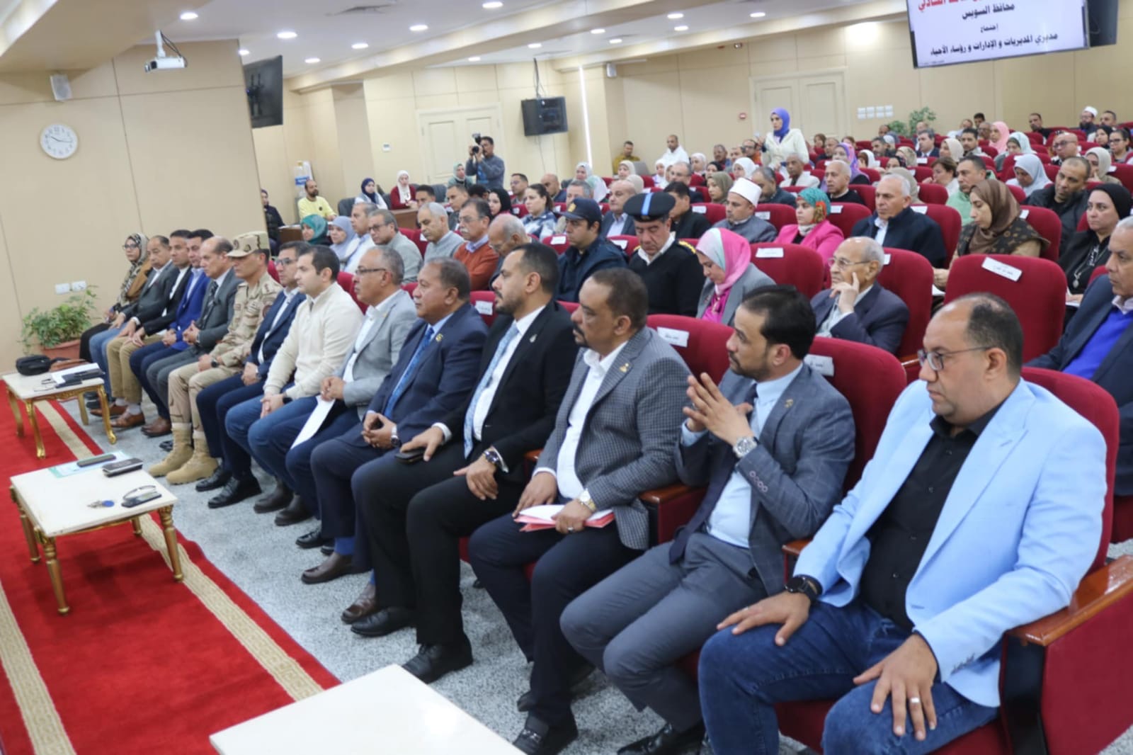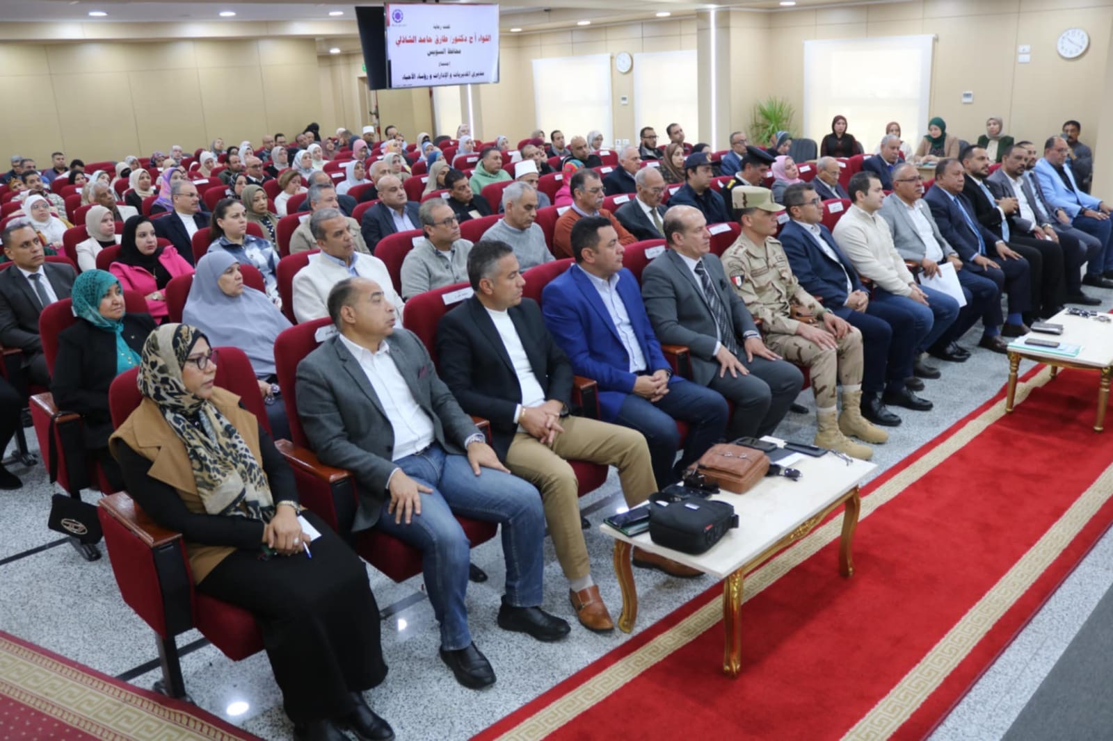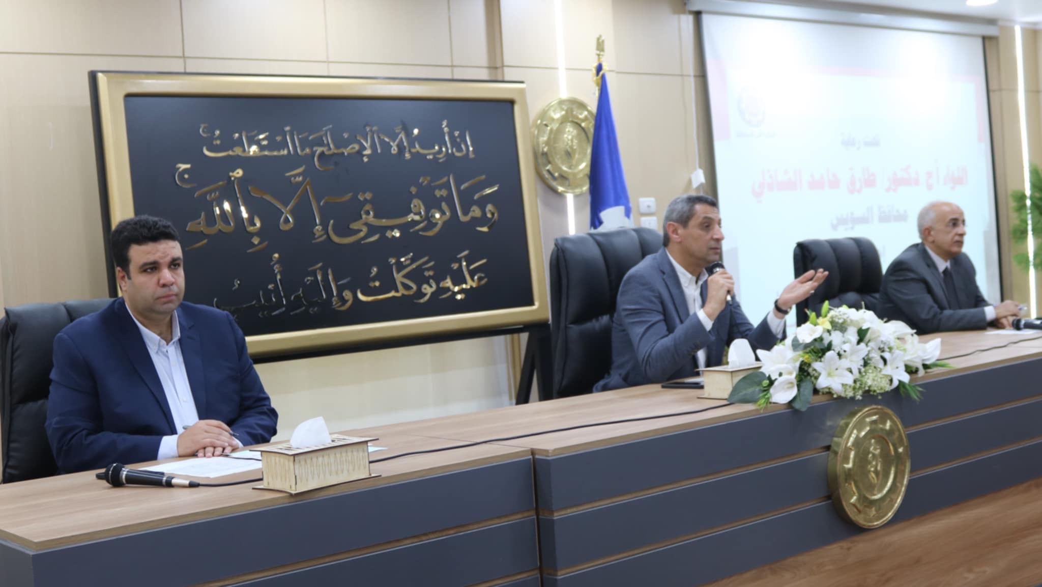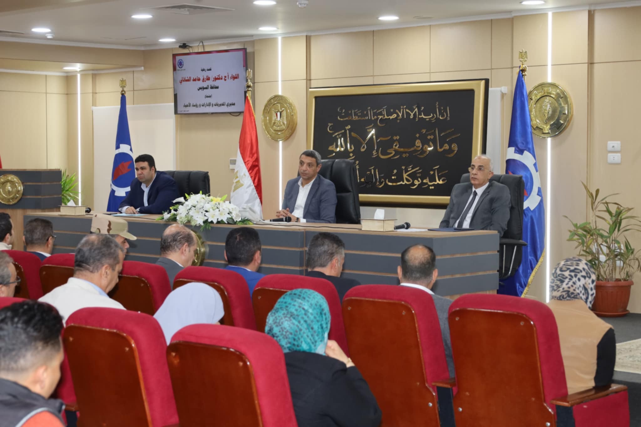 عقد اللواء أ.ح دكتور / طارق حامد الشاذلي محافظ السويس اللقاء الأسبوعي بمديري المديريات والإدارات والقيادات التنفيذية وذلك بحضور الدكتور / عبد الله رمضان نائب المحافظ والأستاذ / أحمد وزيري السكرتير العام للمحافظة واللواء / عارف البركاوي السكرتير العام المساعد ورؤساء الأحياء وممثلي الجهات التنفيذية و أعضاء مجلسي النواب والشيوخ بالسويس وعدد من المواطنين .