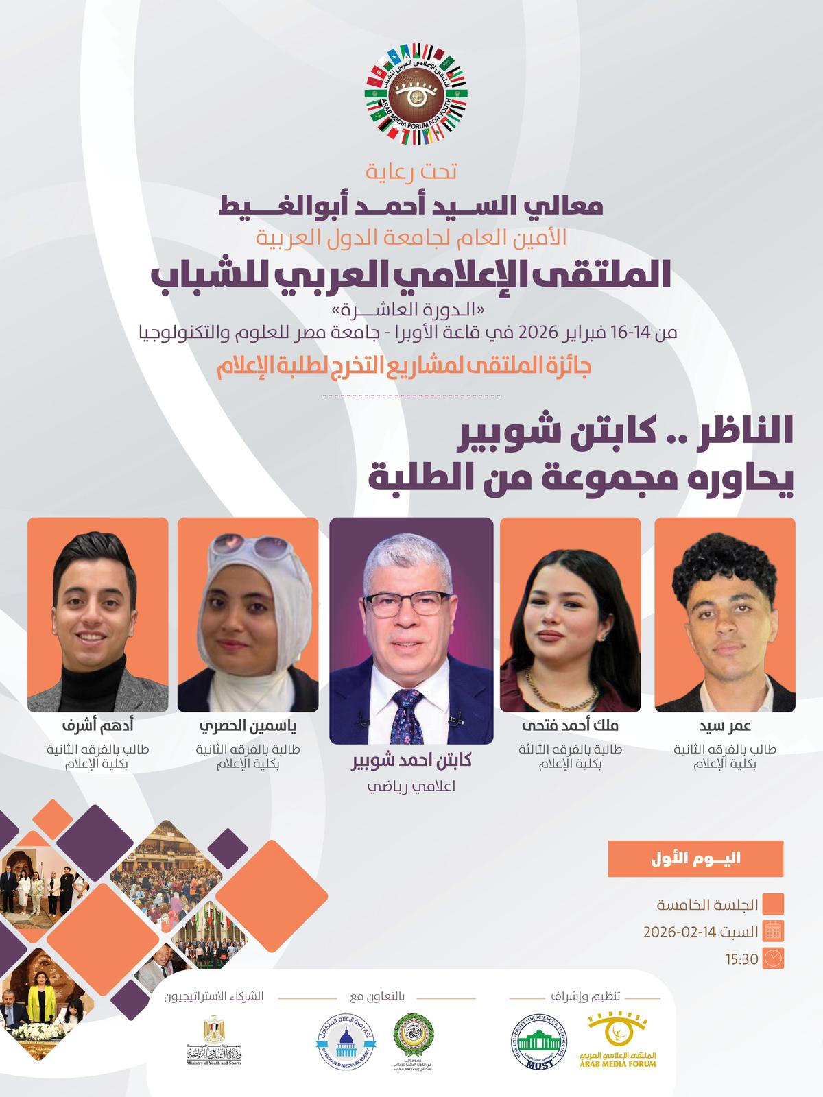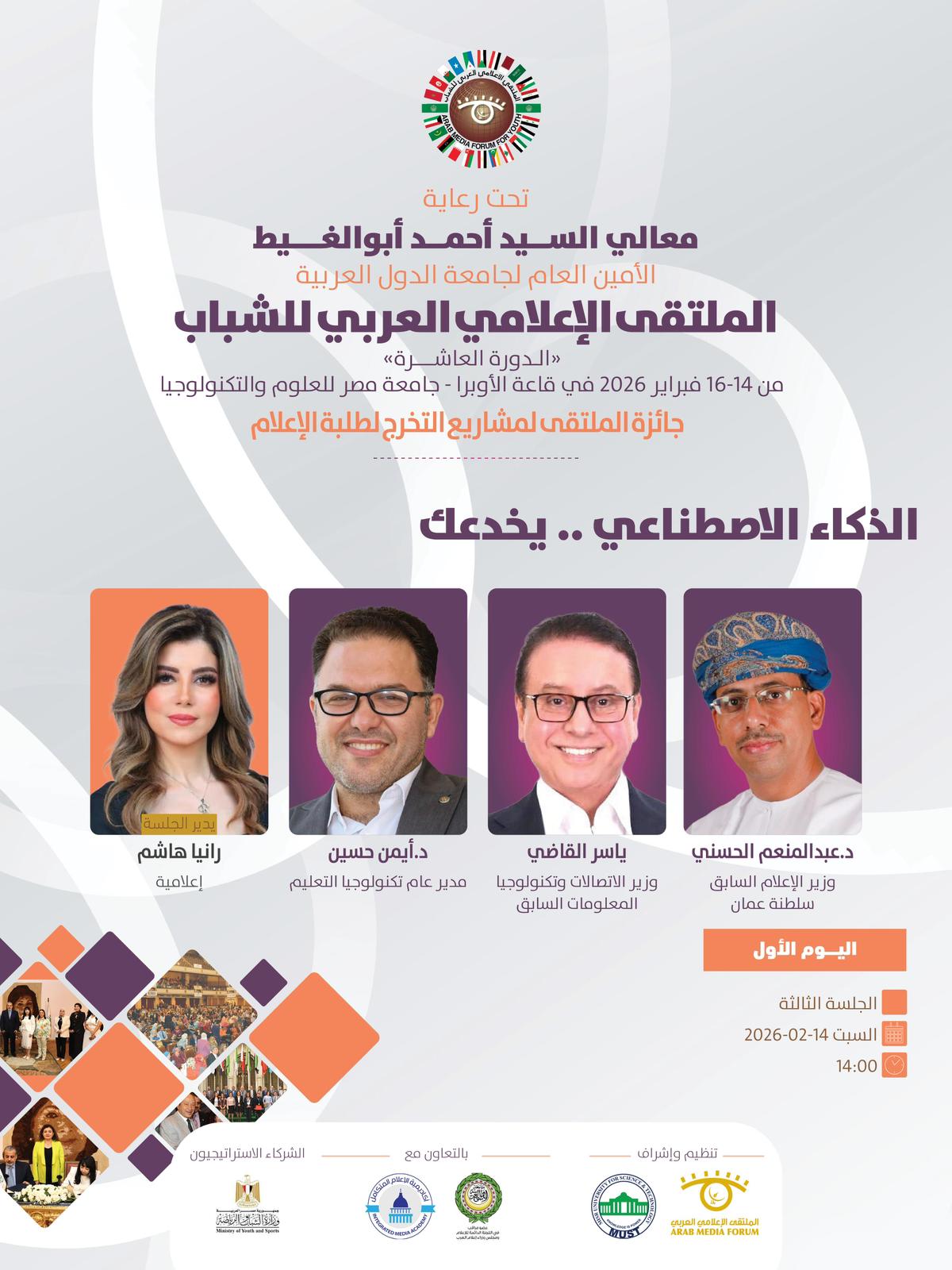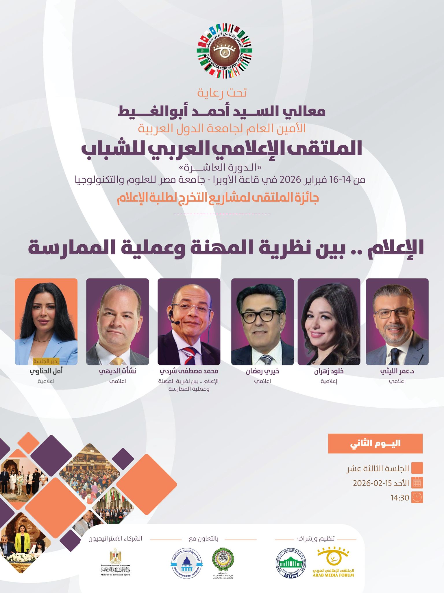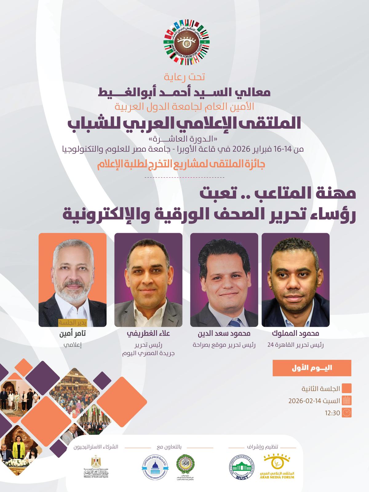 تنطلق فعاليات الملتقى الإعلامي العربي للشباب في دورته العاشره الذي ينظمه الملتقى الإعلامي العربي بالتعاون مع جامعة مصر للعلوم والتكنولوجيا ، وبرعاية كريمة من معالي السيد أحمد أبوالغيط الأمين العام لجامعة الدول العربية ، وذلك خلال الفترة ما بين 14 حتى 16 فبراير 2026.