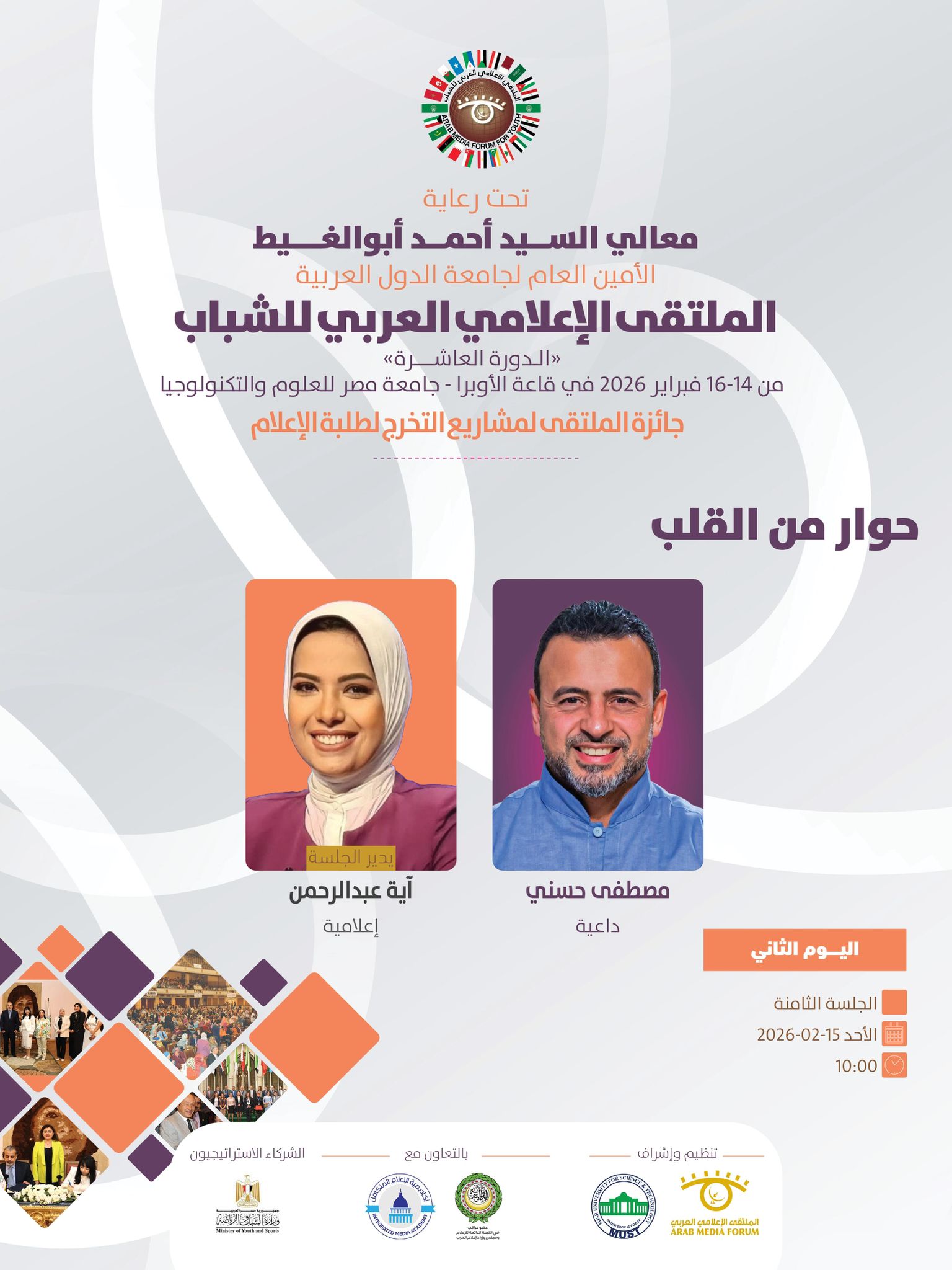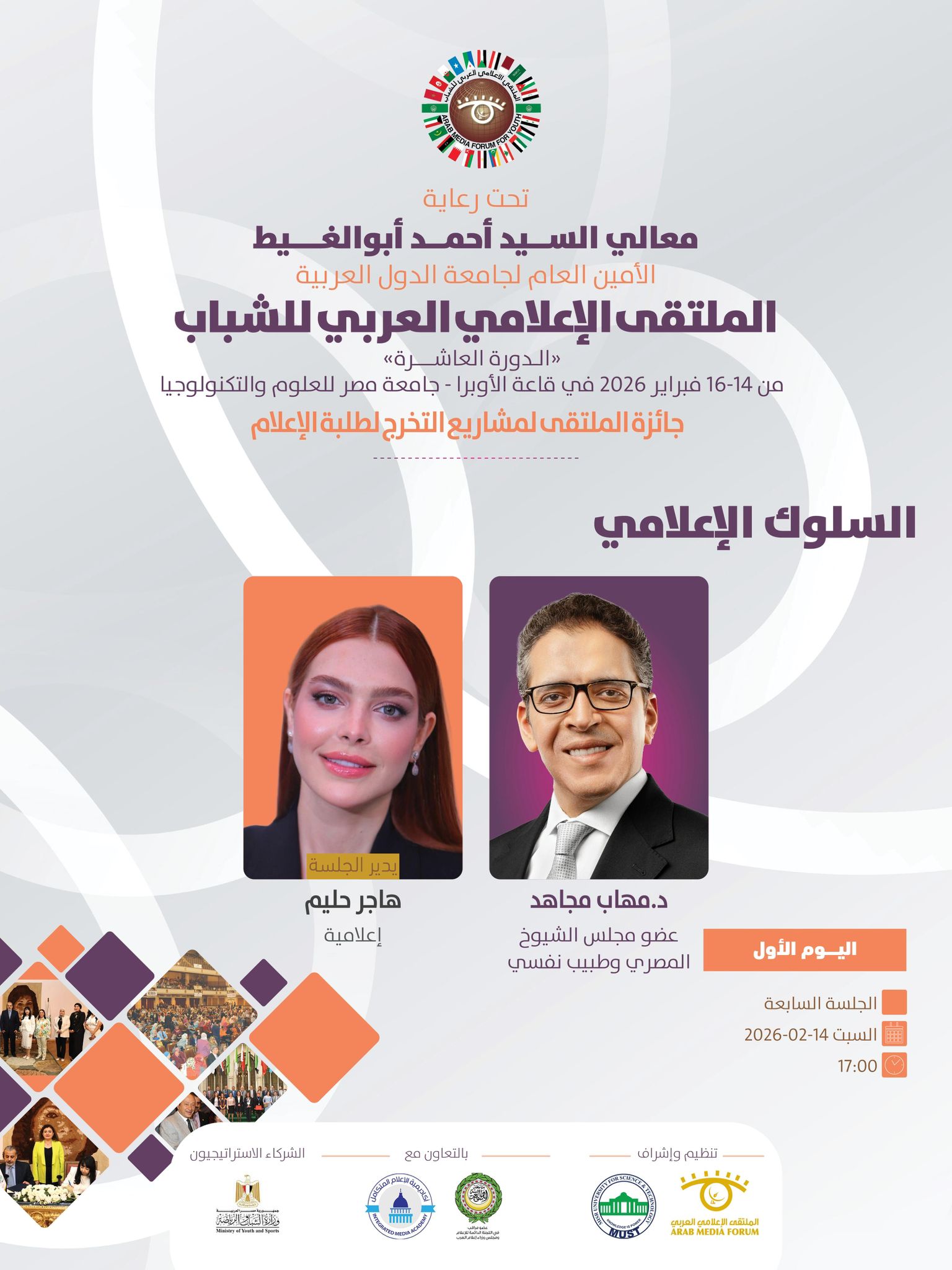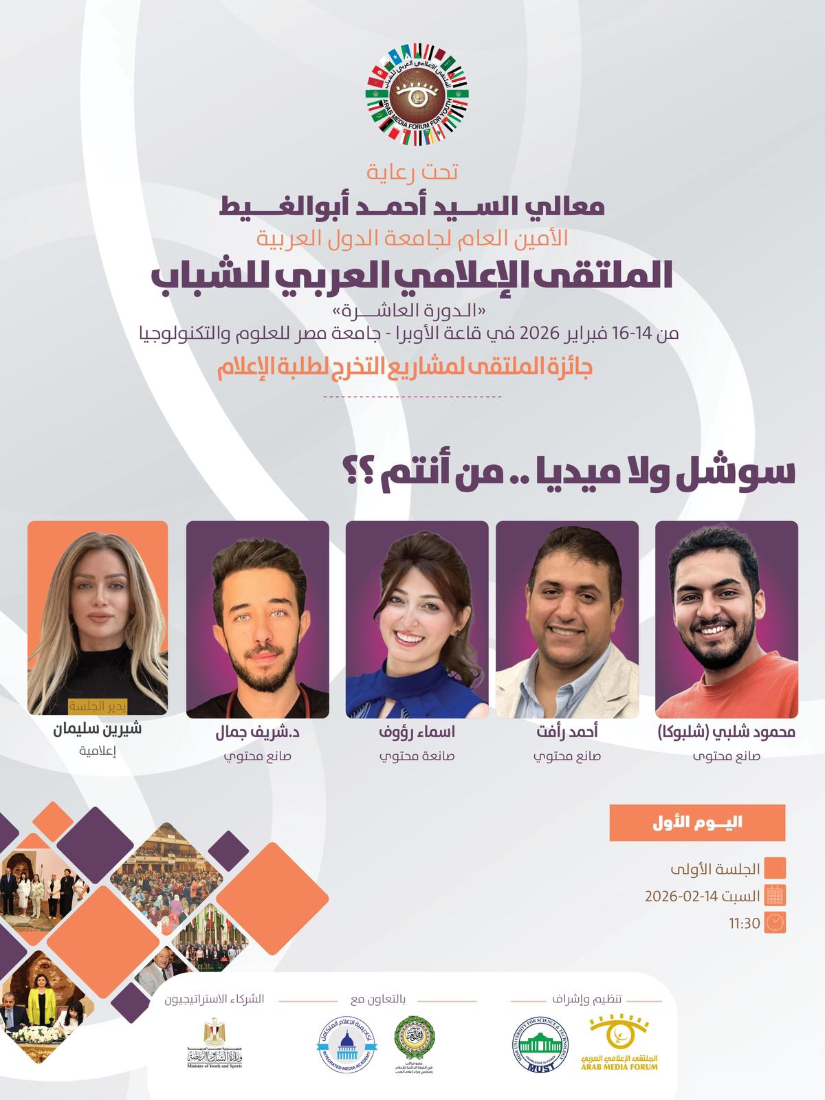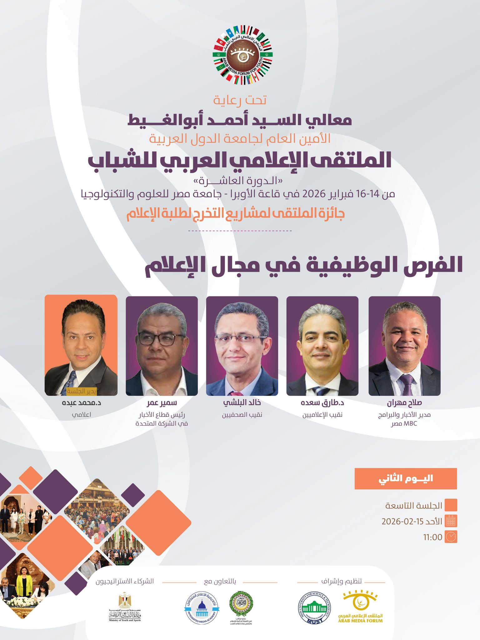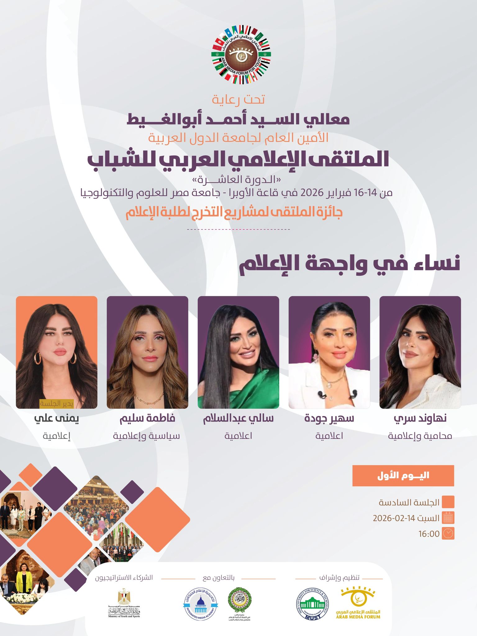 تنطلق فعاليات الملتقى الإعلامي العربي للشباب في دورته العاشره الذي ينظمه الملتقى الإعلامي العربي بالتعاون مع جامعة مصر للعلوم والتكنولوجيا ، وبرعاية كريمة من معالي السيد أحمد أبوالغيط الأمين العام لجامعة الدول العربية ، وذلك خلال الفترة ما بين 14 حتى 16 فبراير 2026.