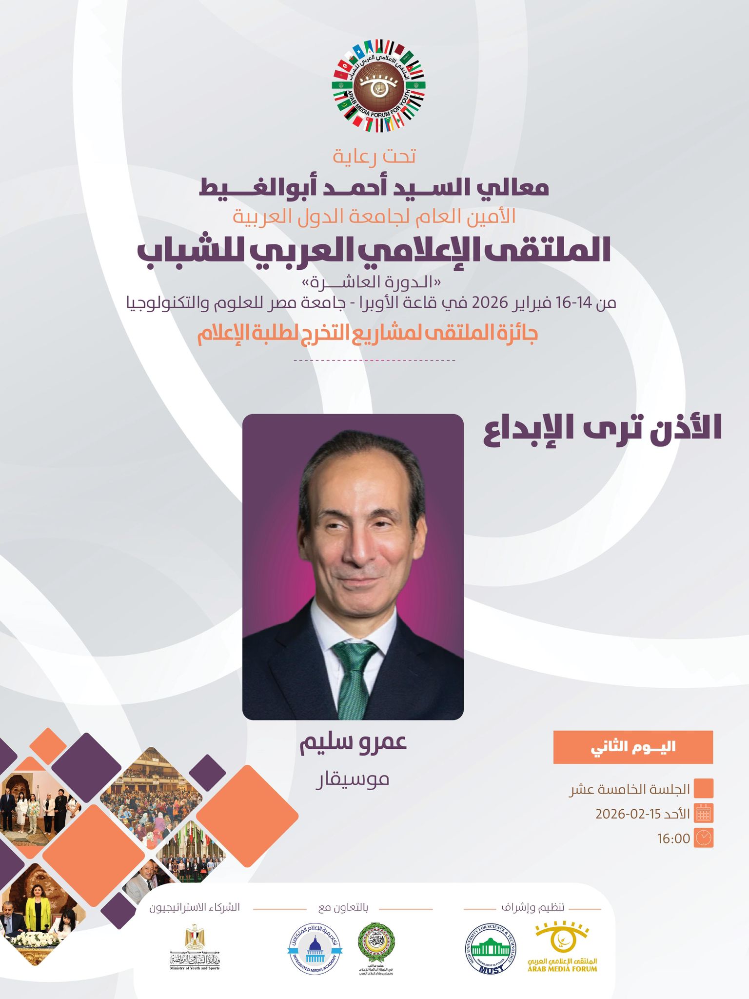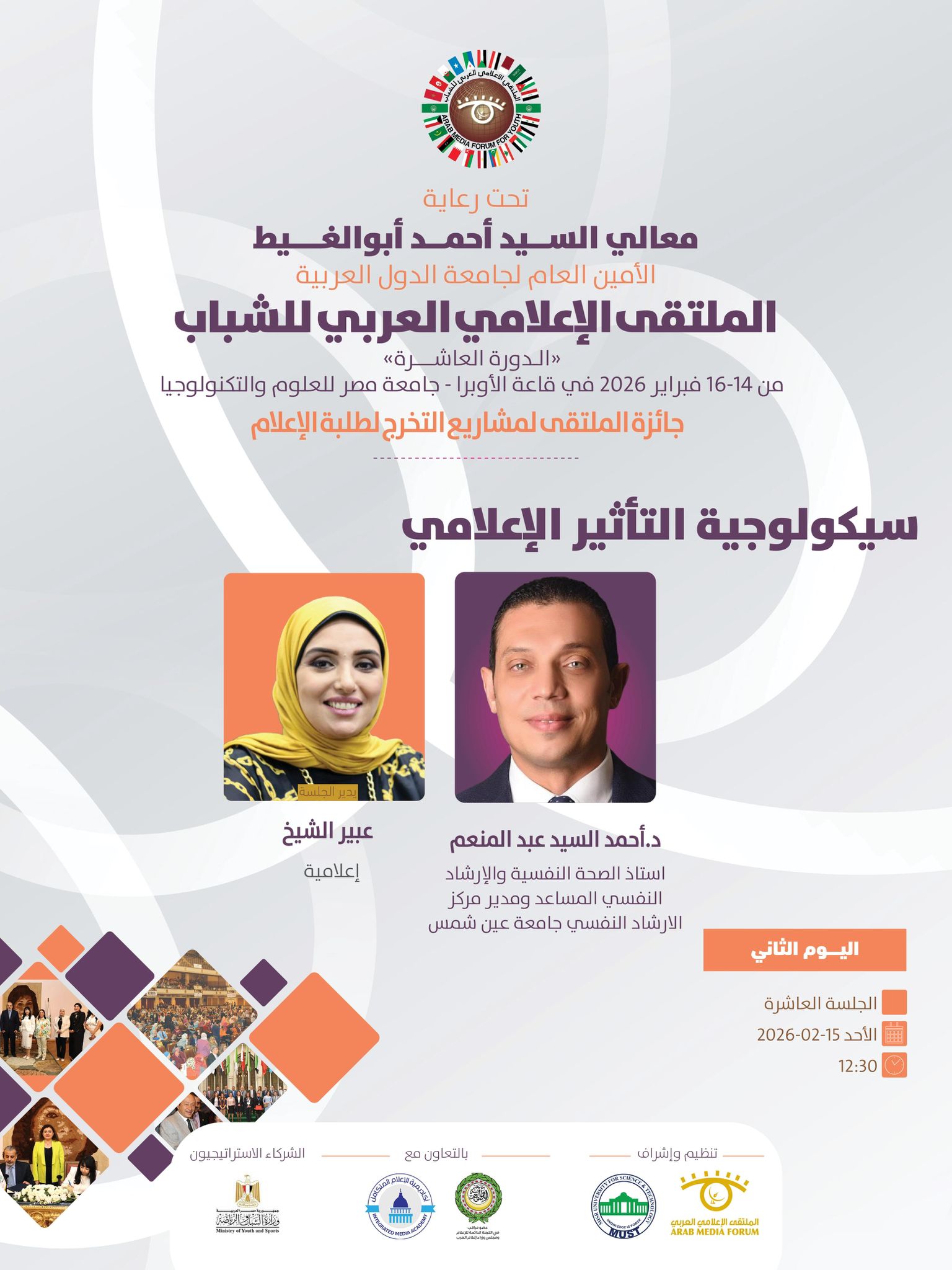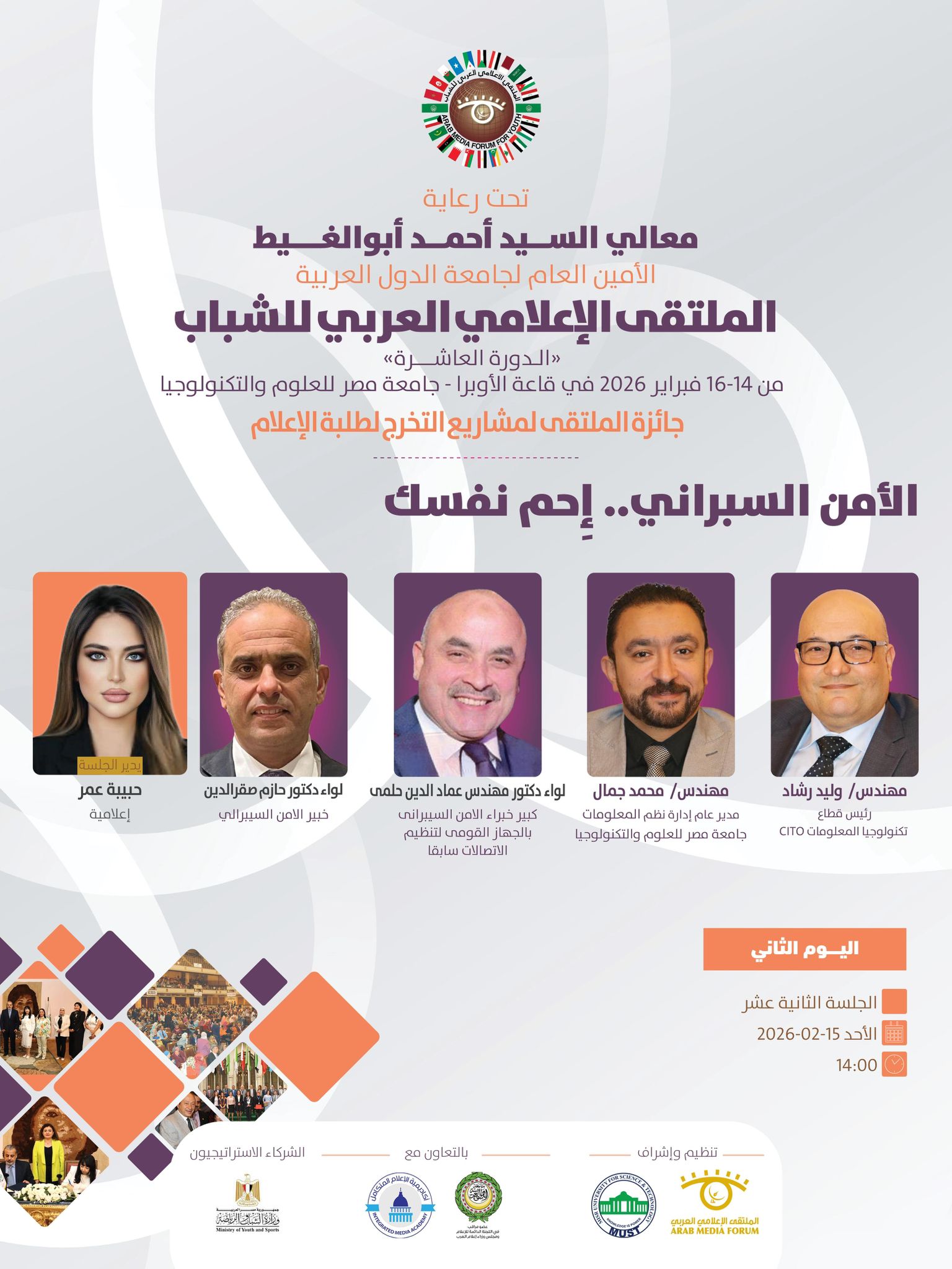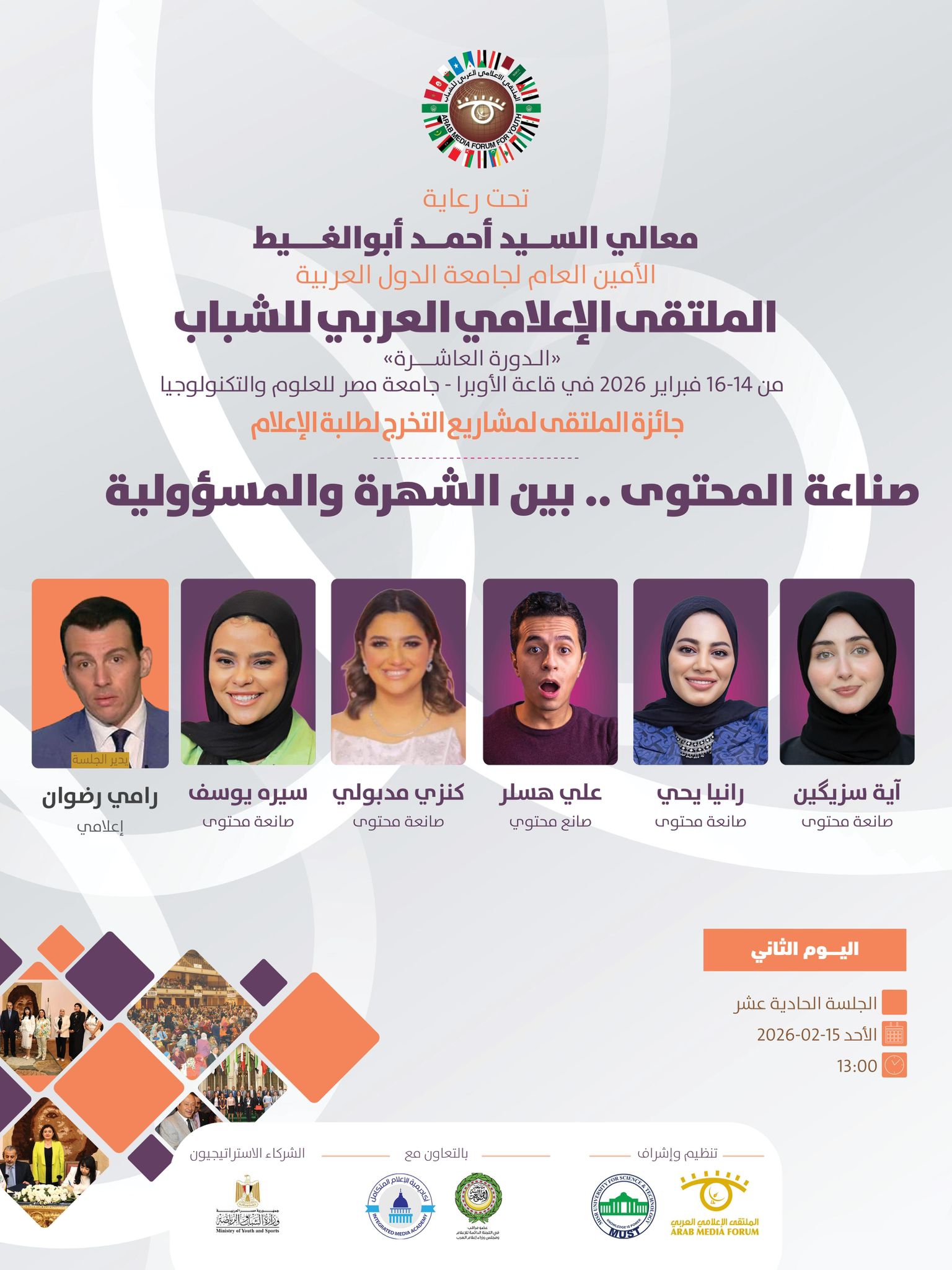 تنطلق فعاليات الملتقى الإعلامي العربي للشباب في دورته العاشره الذي ينظمه الملتقى الإعلامي العربي بالتعاون مع جامعة مصر للعلوم والتكنولوجيا ، وبرعاية كريمة من معالي السيد أحمد أبوالغيط الأمين العام لجامعة الدول العربية ، وذلك خلال الفترة ما بين 14 حتى 16 فبراير 2026.
