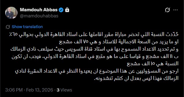 وقال ممدوح عباس عبر حسابه على «إكس»: « حددت النسبة التي تحضر مباراة مقرر إقامتها على استاد القاهرة الدولي بحوالي 65 ألف أو ما يزيد من السعة الإجمالية للاستاد و هي 75 ألف مشجع».