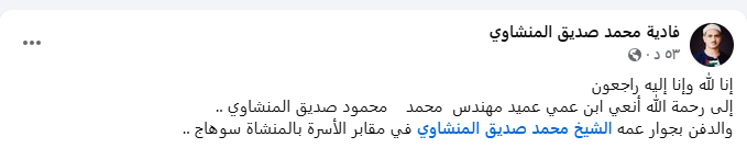وكتبت نجلة الشيخ محمد صديق المنشاوي: «الدفن بجوار عمه الشيخ محمد صديق المنشاوي في مقابر الأسرة بالمنشاة سوهاج».