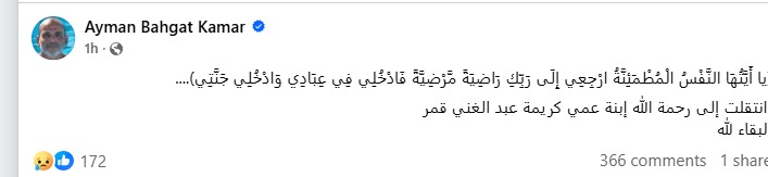 وأعلن أيمن بهجت قمر وفاة ابنة عمه، حيث كتب عبر حسابه الرسمي بموقع “فيسبوك”: يا أيتها النفس المطمئئة إرجعي إلى ربك راضية مرضية فادخلي في عبادي وادخلي جنتي، انتقلت إلى حمة الله ابنة عمي كريم عبدالغني قمر، البقاء لله.