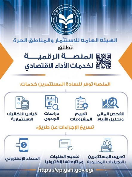 أعلنت الهيئة العامة للاستثمار والمناطق الحرة عن إطلاق المنصة الرقمية لخدمات قطاع الأداء الاقتصادي، وذلك كمنصة موحدة لتقديم الخدمات الفنية المتخصصة للمستثمرين، وذلك في إطار توجه الدولة نحو التحول الرقمي وتطوير البنية المعلوماتية للخدمات الاستثمارية.