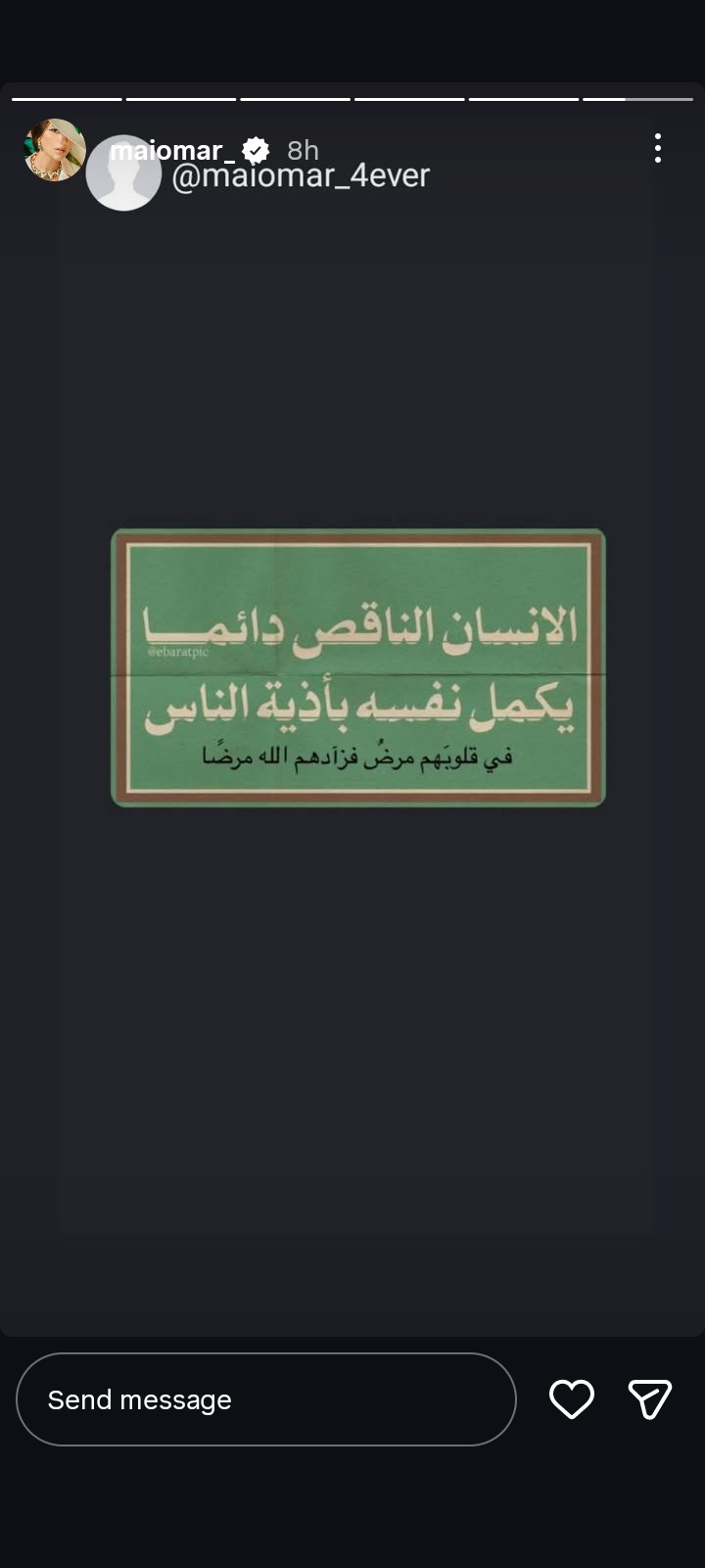 وكتبت مي عمر عبر حسابها الرسمي بموقع التواصل الاجتماعي “فيسبوك”: الإنسان الناقص دايما بيكمل نفسه بأذية الناس، في قلوبهم مرض فزادهم الله مرضا.