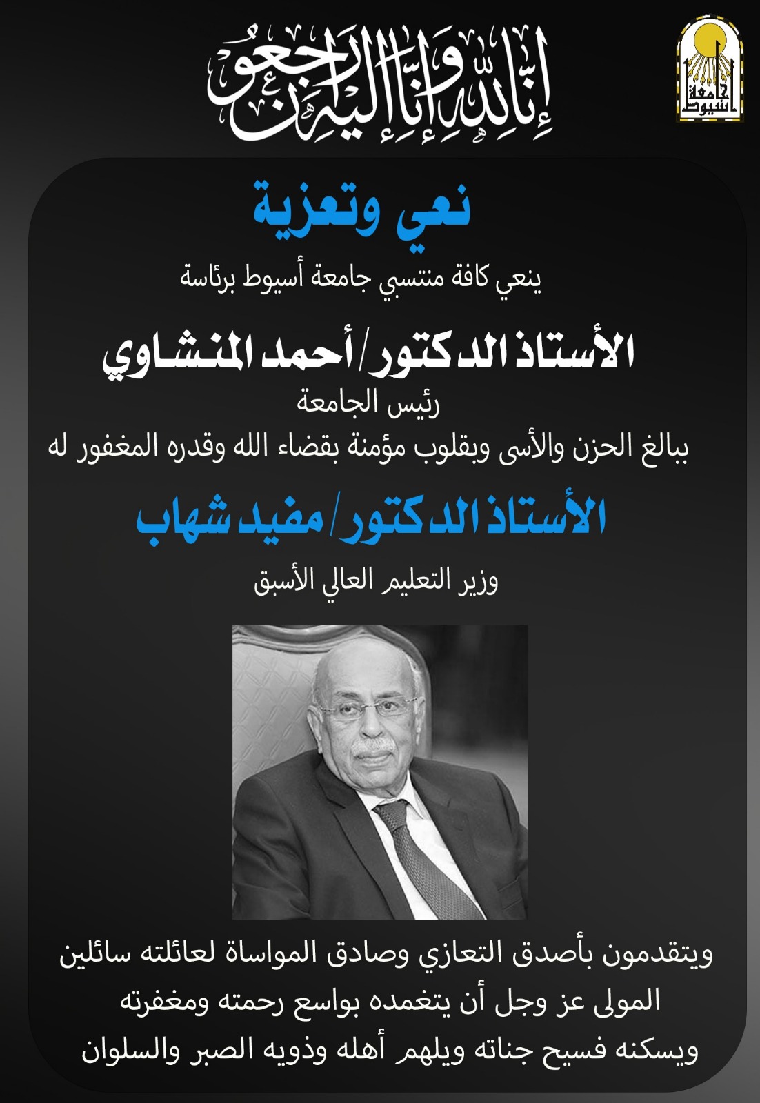 في أجواء خيم عليها الحزن والأسى لفقدان واحد من أبرز رموز الفكر القانوني والعمل السياسي في مصر، نعى الأستاذ الدكتور أحمد المنشاوي، رئيس جامعة أسيوط، ببالغ التأثر، المغفور له بإذن الله الأستاذ الدكتور مفيد شهاب، وزير التعليم العالي الأسبق ووزير الشئون القانونية والمجالس النيابية الأسبق، الذي وافته المنية بعد رحلة حياة طويلة حافلة بالعطاء الوطني، ومسيرة علمية ممتدة تركت بصمات واضحة في تاريخ مصر الحديث.
