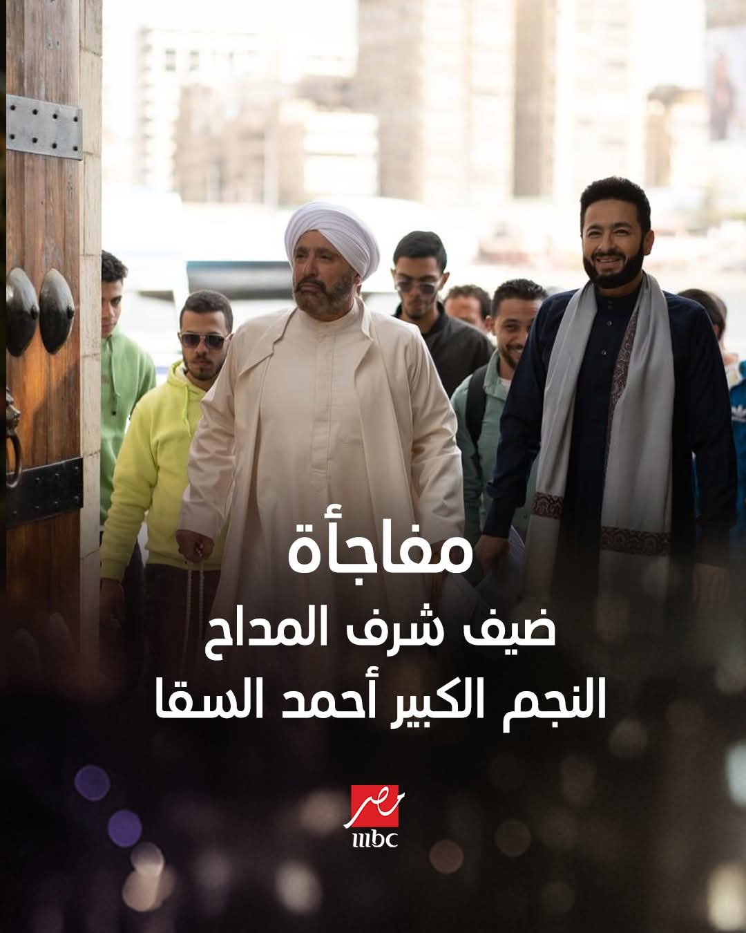 ونشرت إم بي سي مصر صورا من بعض مشاهد المسلسل، وذلك عبر حسابه الرسمي بموقع التواصل الاجتماعي “فيسبوك”،وعلقت عليها قائلا: مفاجأة ضيف شرف المداح أسطورة النهاية النجم الكبير أحمد السقا.