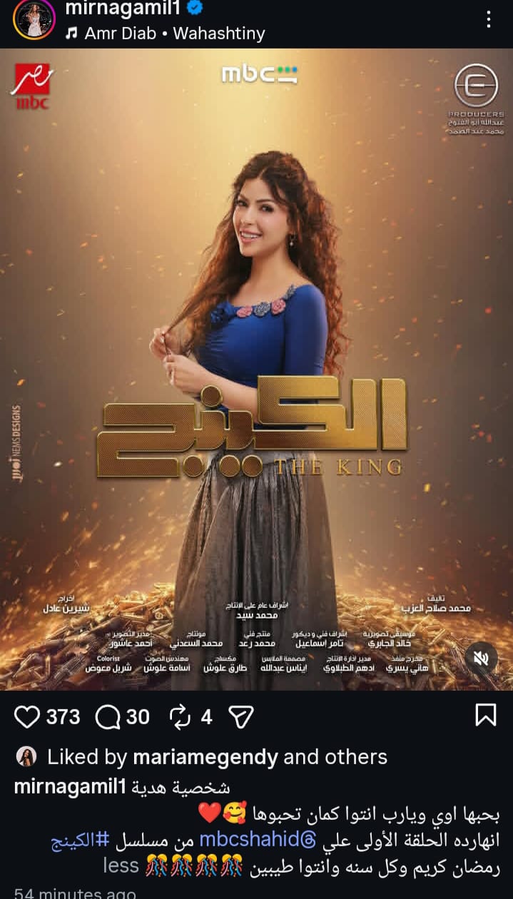 تطرح مجموعة قنوات إم بي سي مصر الحلقة الأولى من مسلسل الكينج بطولة محمد إمام، حسبما أعلنت ميرنا جميل، حيث شاركت جمهورها بالبوستر الرسمي لشخصيتها في المسلسل، وذلك عبر حسابها الرسمي بموقع التواصل الاجتماعي “انستجرام”، وعلقت عليها قائلة: شخصية هدية بحبها أوي، ويا ريت أنوتا كمان تحبوها، النهاردة الحلقة الأولى من مسلسل الكينج، رمضان كريم وكل سنة وأنتوا طيبين.