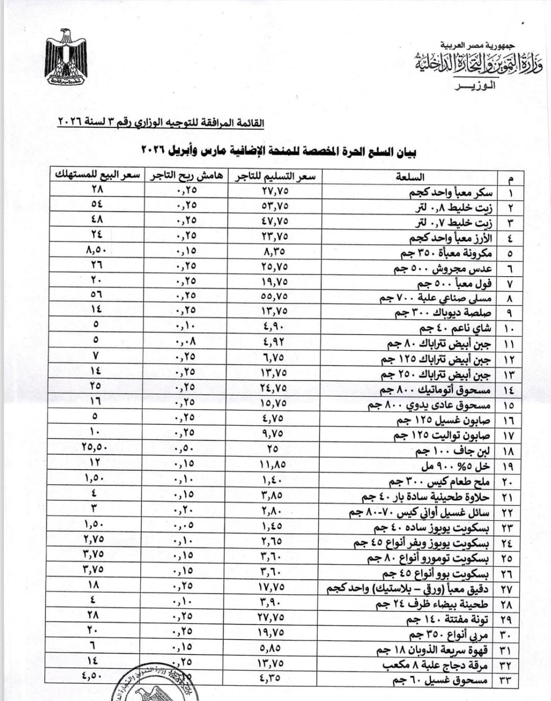 ونص التوجيه على صرف دعم إضافي للمستفيدين من البطاقات التموينية لمدة شهرين، مارس وأبريل 2026، من خلال منافذ التموين ومشروع «جمعيتي»، مع إتاحة قائمة محددة من السلع الحرة بأسعار معلنة وهوامش ربح منظمة للتجار.