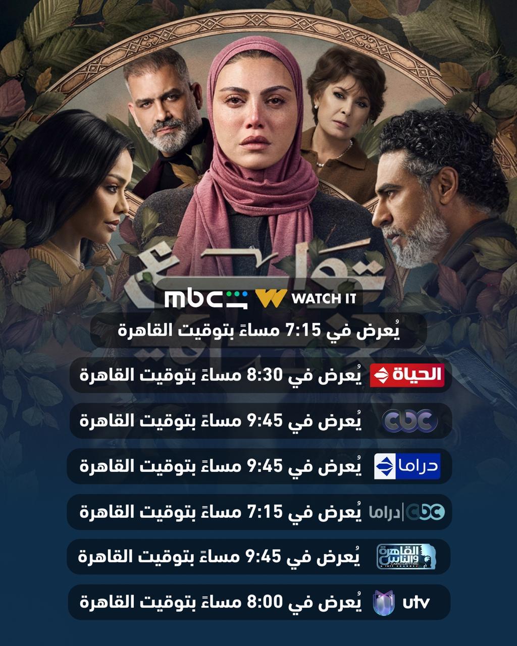 وسوف تُعرض الحلقة الأولى على قناة الحياة في تمام الساعة الثامنة ونصف، وعلى الحياة المسلسلات في تمام الساعة 9:45م، وعلى قناة القاهرة والناس في تمام الساعة 9:45م.