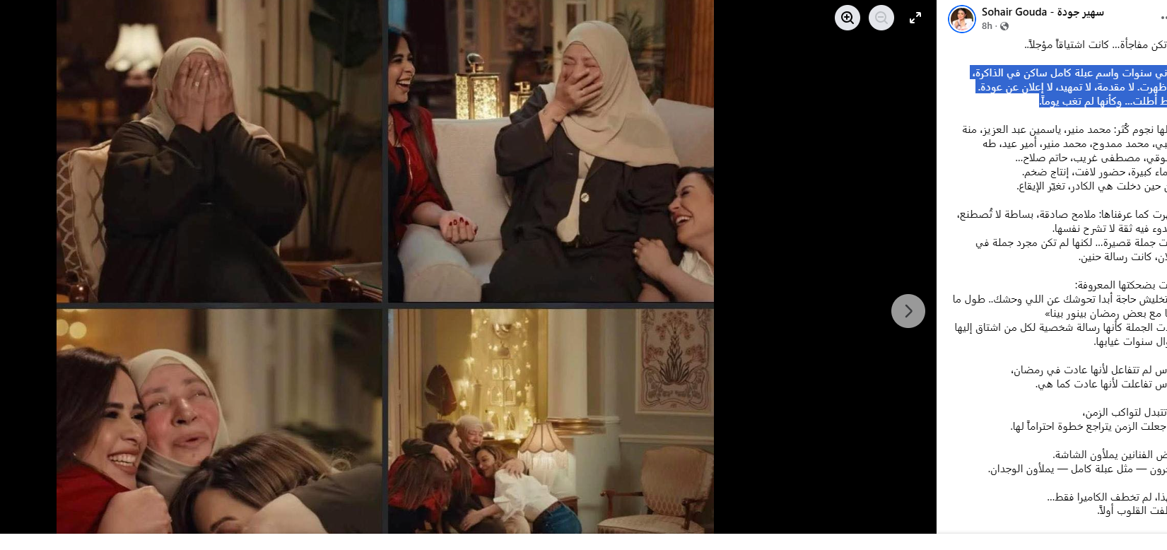ونشرت سهير جودة صورا لعبلة كامل من جانب الإعلان عبر حسابها بموقع التواصل الاجتماعي “فيسبوك”، وعلقت عليها قائلة: لم تكن مفاجأة… كانت اشتياقاً مؤجلاً، ثماني سنوات واسم عبلة كامل ساكن في الذاكرة، ثم ظهرت لا مقدمة، لا تمهيد، لا إعلان عن عودة، فقط أطت، وكأنها لم تغب يوماً.