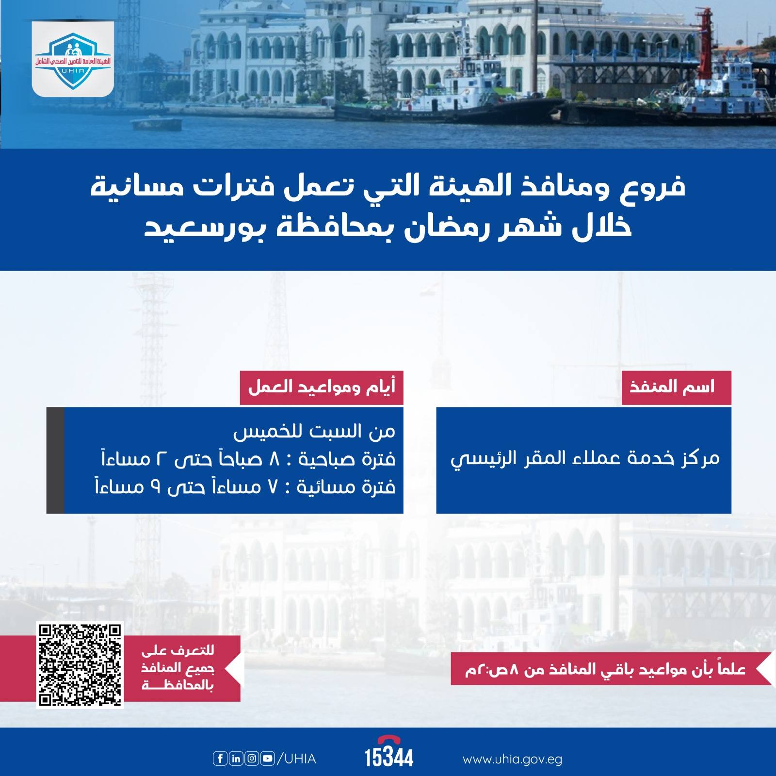 في محافظة بورسعيد، سيعمل الفرع الرئيسي من السبت إلى الخميس خلال الفترتين الصباحية والمسائية لاستقبال المستفيدين وتقديم الخدمات المطلوبة.