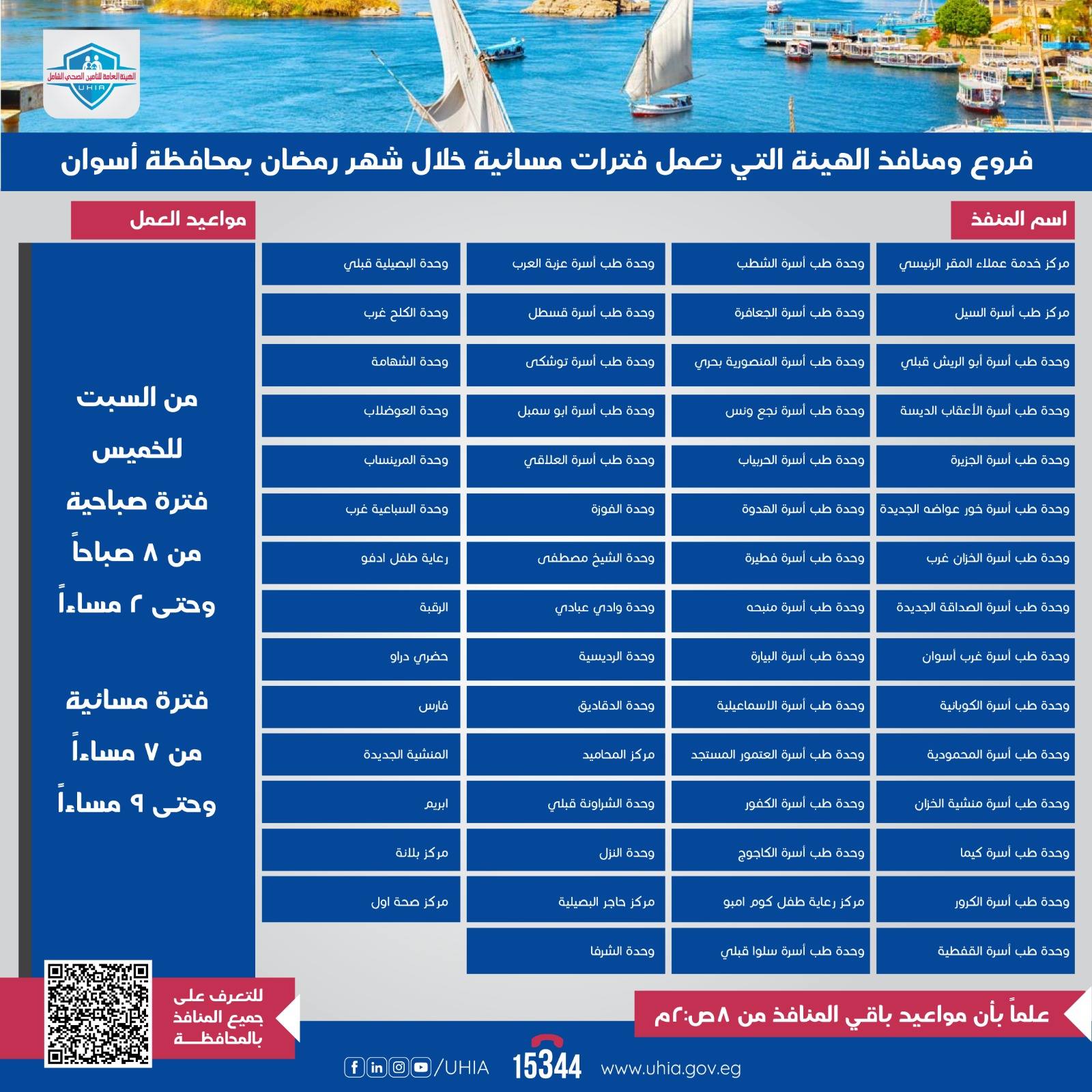 وفي محافظة الأقصر، سيتم العمل خلال الشهر الكريم في 6 منافذ بنظام الفترتين الصباحية والمسائية، وهي: مركز خدمة العملاء بالمقر الرئيسي، وحدة طب أسرة الأقالتة، مركز طب أسرة الأقصر، مركز طب أسرة الكرنك الجديد، مركز طب أسرة أصفون، ووحدة طب أسرة الدولي.