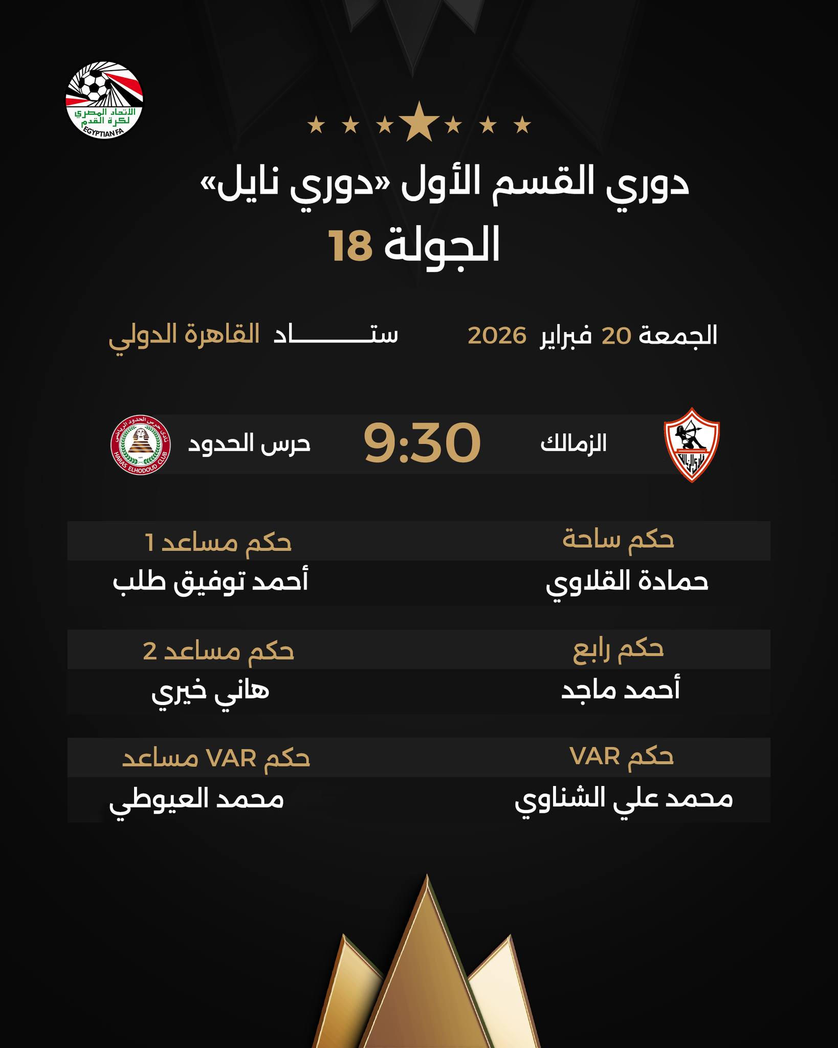 وجاء طاقم حكام مباراة الزمالك وحرس الحدود على النحو التالي: