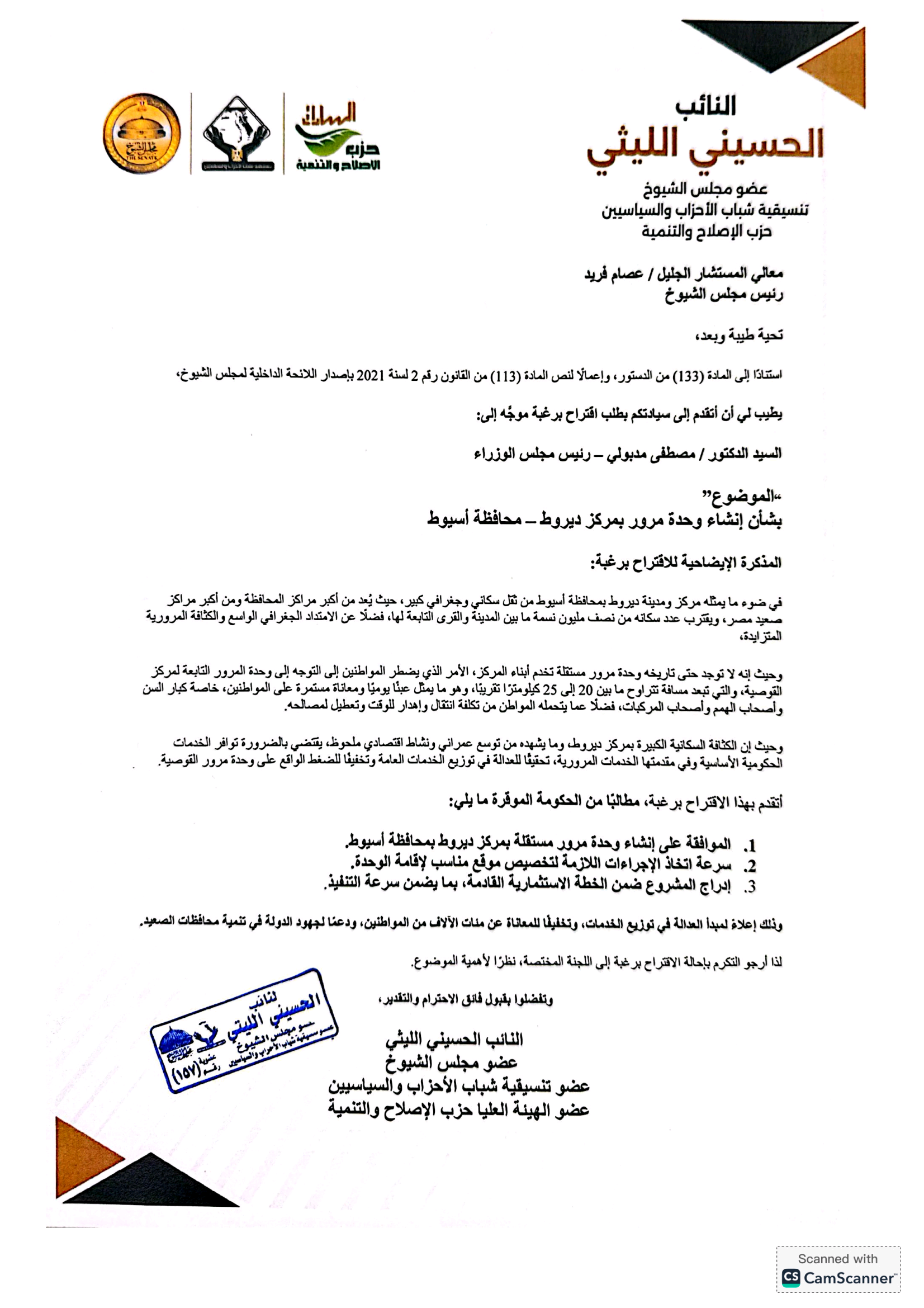 في خطوة برلمانية جادة تعكس انحيازه الحقيقي لمطالب المواطنين وحرصه على تحقيق العدالة في توزيع الخدمات العامة، تقدم النائب الحسيني الليثي، عضو مجلس الشيوخ وعضو تنسيقية شباب الأحزاب والسياسيين، باقتراح برغبة عاجل إلى معالي المستشار عصام فريد، رئيس مجلس الشيوخ، لتوجيهه إلى الدكتور مصطفى مدبولي، رئيس مجلس الوزراء، يطالب فيه بإنشاء وحدة مرور مستقلة بمركز ديروط في محافظة أسيوط.