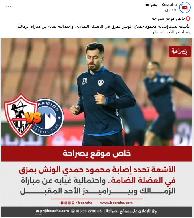 وكان موقع بصراحة قد أكد عن مصادر خاصة داخل نادي الزمالك، عن تعرض محمود حمدي الونش لإصابة بالعضلة الضامة مع احتمالية غيابه عن مباراة بيراميدز المقرر لها الأحد المقبل.