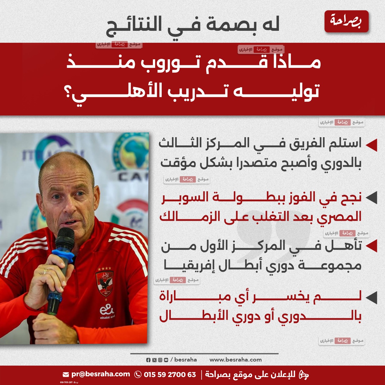 من أبرز إنجازات توروب حتى الآن أنه لم يتعرض لأي خسارة في الدوري المصري أو دوري أبطال إفريقيا منذ توليه المهمة، ليعكس حالة من الانضباط التكتيكي والاستقرار داخل الفريق.