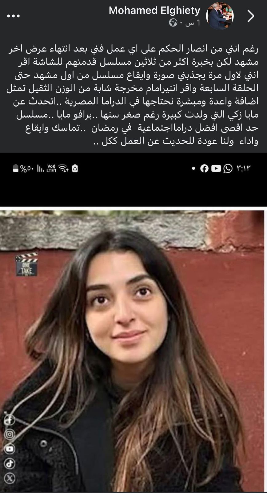 وأضاف أن مايا أشرف زكي تثبت نفسها كمخرجة «من الوزن الثقيل»، تمثل إضافة واعدة ومبشرة للدراما المصرية، معتبرًا أنها «وُلدت كبيرة رغم صغر سنها»، على حد تعبيره، مشيدًا بحالة التماسك والإيقاع والأداء داخل العمل.