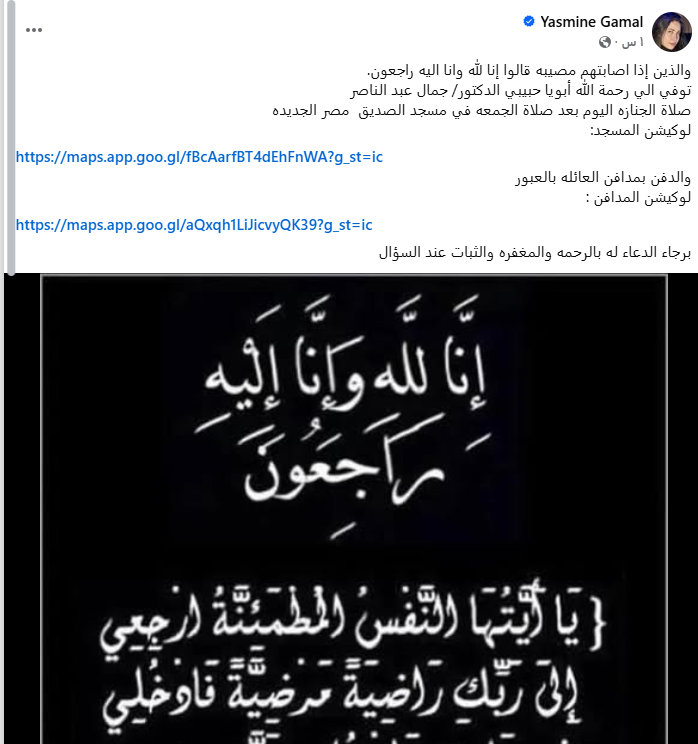 وكتبت ياسمين جمال عبر حسابها الرسمي بموقع التواصل الاجتماعي “فيسبوك”: والذين إذا اصابتهم مصيبه قالوا إنا لله وانا اليه راجعون، توفي الي رحمة الله أبويا حبيبي الدكتور جمال عبد الناصر، صلاة الجنازه اليوم بعد صلاة الجمعه في مسجد الصديق مصر الجديدة.