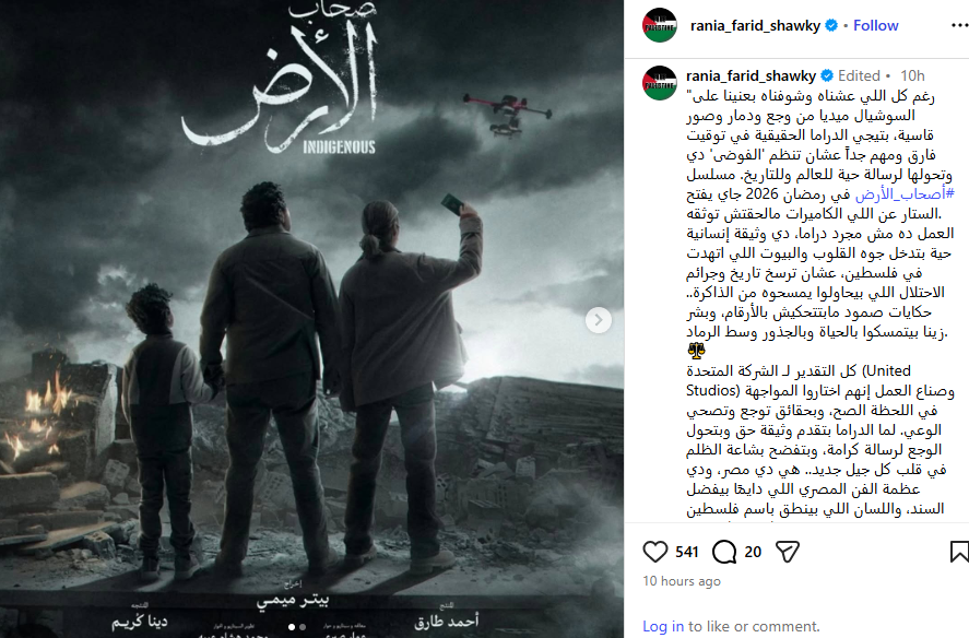 وتابعت: حكايات صمود مابتتحكيش بالأرقام، وبشر زينا بيتمسكوا بالحياة وبالجذور وسط الرماد، كل التقدير لـ الشركة المتحدة" United Studios" وصناع العمل، إنهم اختاروا المواجهة في اللحظة الصح، وبحقائق توجع وتصحي الوعي. لما الدراما بتقدم وثيقة حق وبتحول الوجع لرسالة كرامة.