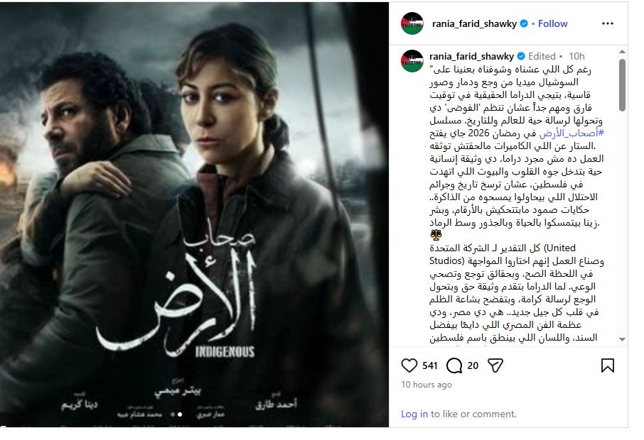 أشادت الفنانة رانيا فريد شوقي بـ مسلسل صُحاب الأرض بطولة إياد نصار ومنة شلبي، والذي يُعرض حاليا ضمن موسم دراما رمضان 2026.