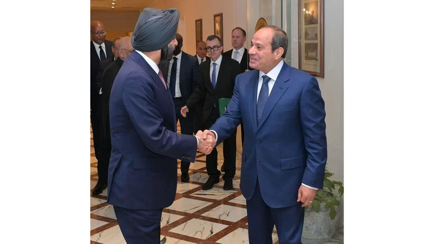 استقبل الرئيس عبد الفتاح السيسي، اليوم، السيد أجاي بانجا، رئيس مجموعة البنك الدولي، وذلك بحضور الدكتور بدر عبد العاطي وزير الخارجية والتعاون الدولي والمصريين بالخارج، والدكتور أحمد رستم وزير التخطيط والتنمية الاقتصادية، و أثيوبيس تافارا نائب رئيس مؤسسة التمويل الدولية، و أوسمان ديون نائب رئيس البنك الدولي، و تريفور كينكايد مستشار رئيس مجموعة البنك الدولي، و عبد العزيز الملا المدير التنفيذي لمجموعة الدول العربية في البنك الدولي، والسفير هشام سيف الدين المدير التنفيذي المناوب لدى مجموعة البنك الدولي.