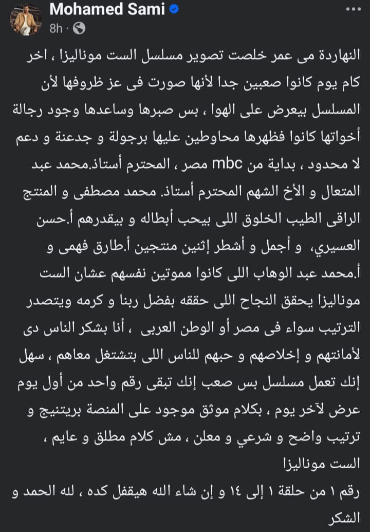 انتهى فريق عمل مسلسل “الست موناليزا” بطولة زوجته الفنانة مي عمر اليوم من تصوير أخر مشاهد المسلسل، مشيرا أن أحداث المسلسل تنتهي عند الحلقة الرابعة عشر فقط، نظرا لظروف وفاة والد زوجته.