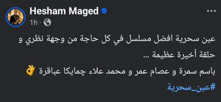 وكتب هشام ماجد عبر حسابه الرسمي بموقع التواصل الاجتماعي “فيسبوك”: عين سحرية أفضل مسلسل في كل حاجة من وجهة نظري و حلقة أخيرة عظيمة، باسم سمرة و عصام عمر و محمد علاء چمايكا عباقرة.