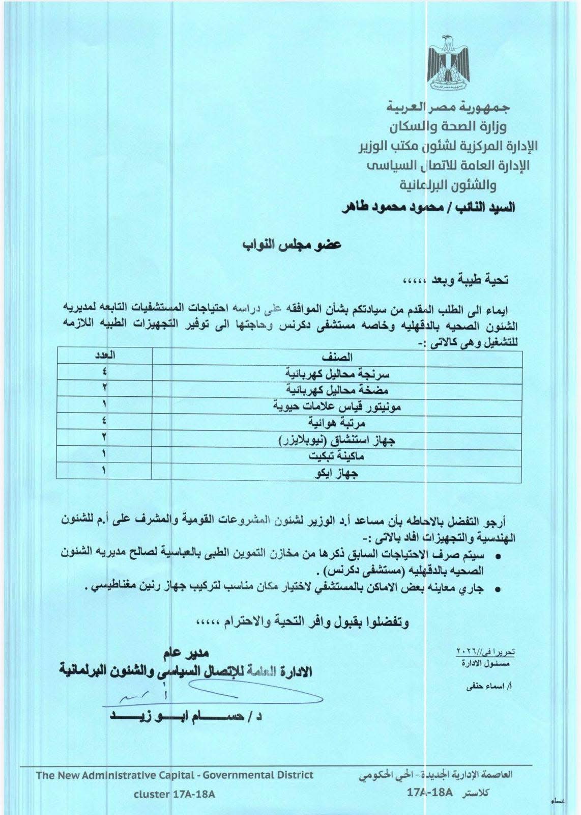 لتحسين الخدمة المقدمة للأهالى .. النائب محمود طاهر يحصل على موافقة بتوفير أجهزة طبية حيوية بمستشفى دكرنس