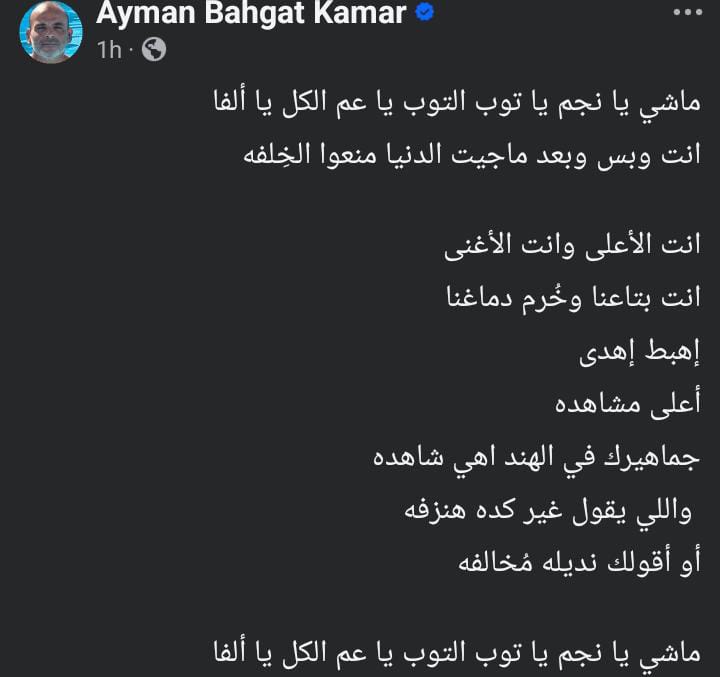 وكتب أيمن بهجت قمر عبر حسابها الرسمي بموقع التواصل الاجتماعي “فيسبوك”: ماشي يا نجم يا توب التوب يا عم الكل يا ألفا، إنت وبس وبعد ماجيت الدنيا منعوا الخِلفه، إنت الأعلى وإنت الأغنى، وإنت بتاعنا وخُرم دماغنا، إهبط إهدى أعلى مشاهده، جماهيرك في الهند اهي شاهده، واللي يقول غير كده هنزفه، أو أقولك نديله مُخالفه، ماشي يا نجم يا توب التوب يا عم الكل يا ألفا.