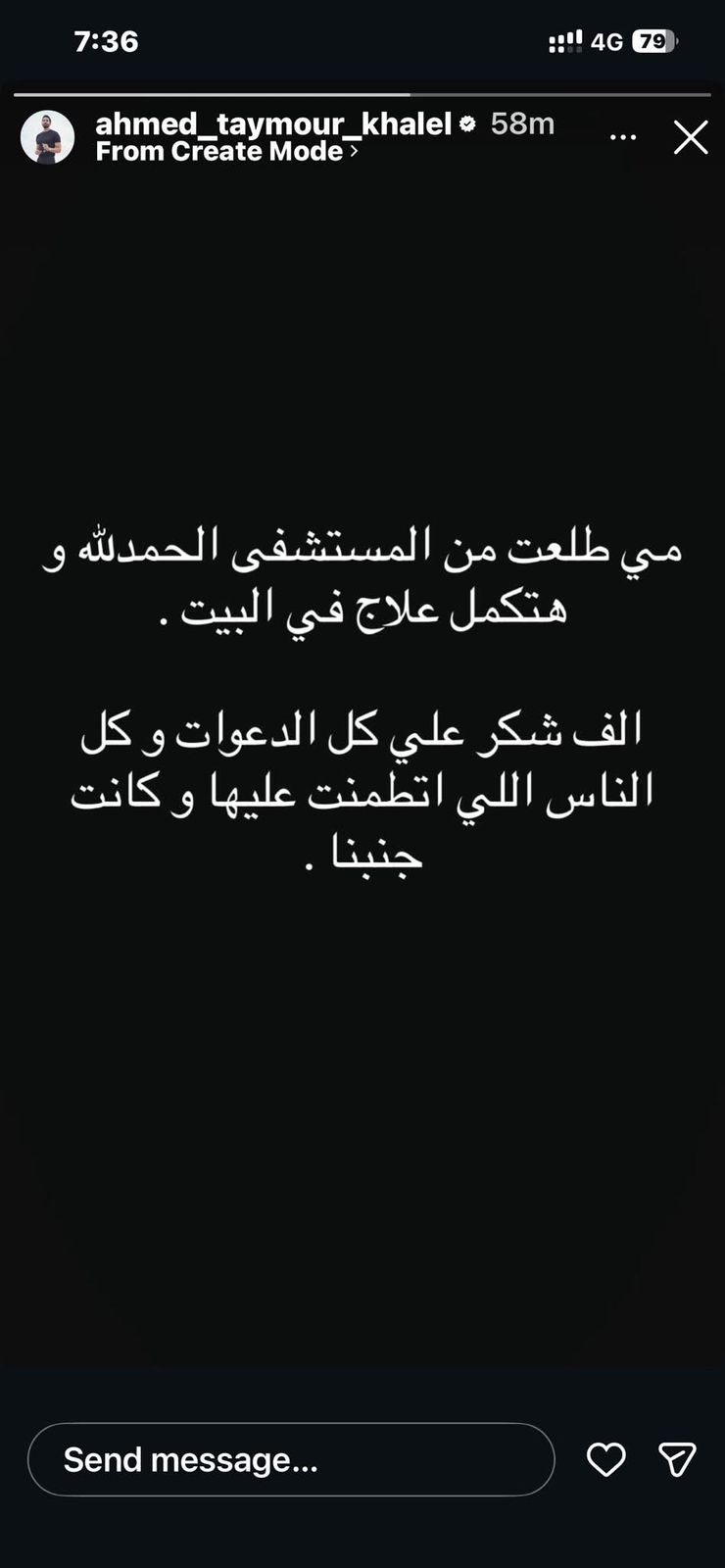 وكتب أحمد تيمور عبر حسابه بموقع التواصل الاجتماعي “إنستجرام”: "مي طلعت من المستشفى الحمد لله، وهتكمل علاج في البيت، ألف شكر على كل الدعوات، وكل الناس اللي اتطمنت عليها وكانت جنبنا".