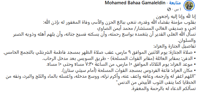 وأعلنت أسرة الراحل أن العزاء سيقام غدًا الثلاثاء 10 مارس، بداية من الساعة السابعة والنصف مساء وحتى العاشرة مساء، بقاعة الفردوس بمسجد القوات المسلحة أمام سيتي ستارز.