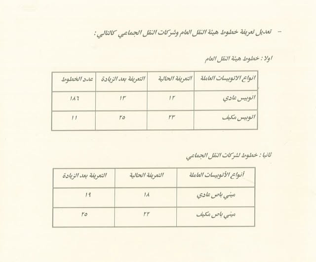 كما شمل القرار خطوط شركات النقل الجماعي، إذ تم رفع تعريفة الميني باص العادي إلى 19 جنيهًا بدلًا من 18 جنيهًا، بينما ارتفعت تعريفة الميني باص المكيف إلى 25 جنيهًا بدلًا من 22 جنيهًا، مع التأكيد على ضرورة التزام السائقين بالتعريفة المقررة.
