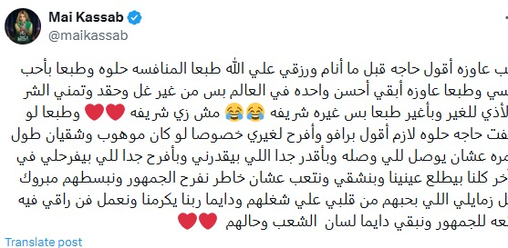 وكتبت مي كساب عبر حسابها الرسمي بمنصة “إكس”: طب عاوزه أقول حاجه قبل ما أنام ورزقي علي الله طبعا المنافسه حلوه وطبعا بأحب نفسي، وطبعا عاوزه أبقي أحسن واحده في العالم، بس من غير غل وحقد وتمني الشر والأذي للغير ، وبأغير طبعا بس غيره شريفة مش زي شريفة، وطبعا لو شفت حاجه حلوه لازم أقول برافو وأفرح لغيري خصوصا، لو كان موهوب وشقيان طول عمره عشان يوصل للي وصله، وبأقدر جدا اللي بيقدرني وبأفرح جدا للي بيفرحلي، في الآخر كلنا بيطلع عينينا وبنشقي ونتعب عشان خاطر نفرح الجمهور ونبسطهم مبروك لكل زمايلي اللي بحبهم من قلبي علي شغلهم ودايما ربنا يكرمنا، ونعمل فن راقي فيه متعه للجمهور ونبقي دايما لسان الشعب وحالهم.