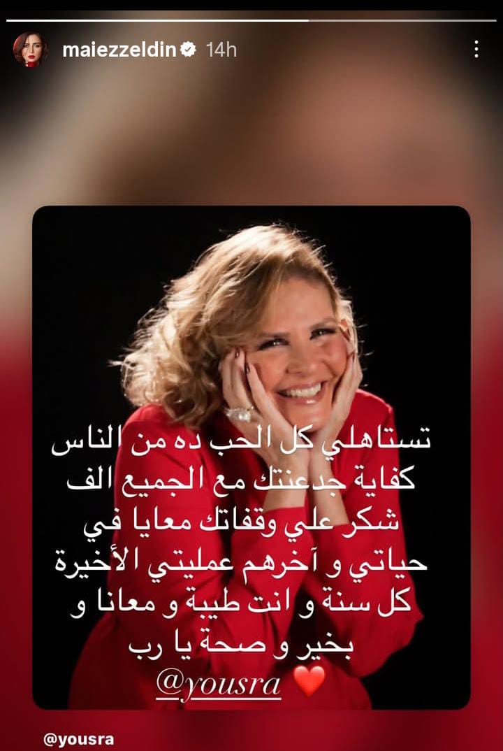 ونشرت مي عز الدين صورة لـ يسرا، وذلك عبر حسابها الرسمي بموقع التواصل الاجتماعي “انستجرام”، وعلقت عليها قائلة: تستاهلي كل الحب ده من الناس كفاية جدعنتك مع الجميع، ألف شكر على وقفتك معايا في حياتي وآخرهم عمليتي الأخيرة، كل سنة وإنت طيبة ومعانا وبخير وصحة يا رب.