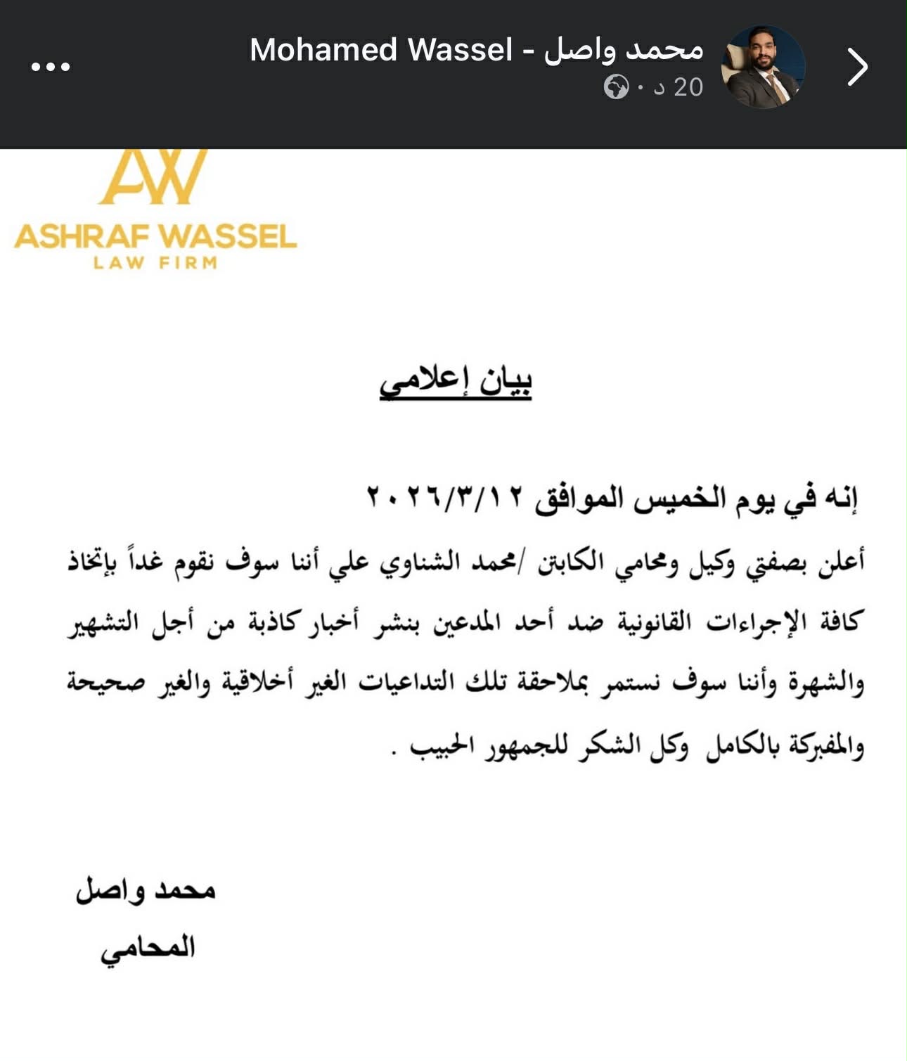 ويتولى محمد أشرف واصل مهمة الدفاع عن محمد الشناوي، حارس الأهلي ومنتخب مصر، حيث أصدر بيانًا مساء أمس الأربعاء، لتوضيح الخطوات المقبلة فيما يخص أزمة فتاة الإنستجرام.