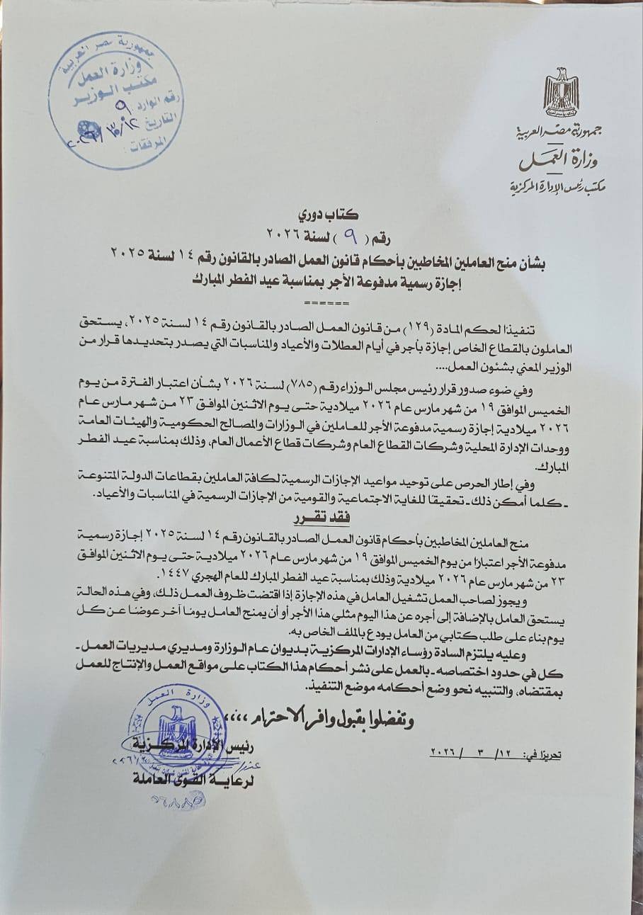 كما يأتي في ضوء قرار رئيس مجلس الوزراء رقم 785 لسنة 2026، الذي أعلن أن الفترة من 19 حتى 23 مارس 2026 إجازة رسمية مدفوعة الأجر للعاملين بالوزارات والمصالح الحكومية والهيئات العامة وشركات القطاع العام وقطاع الأعمال العام.