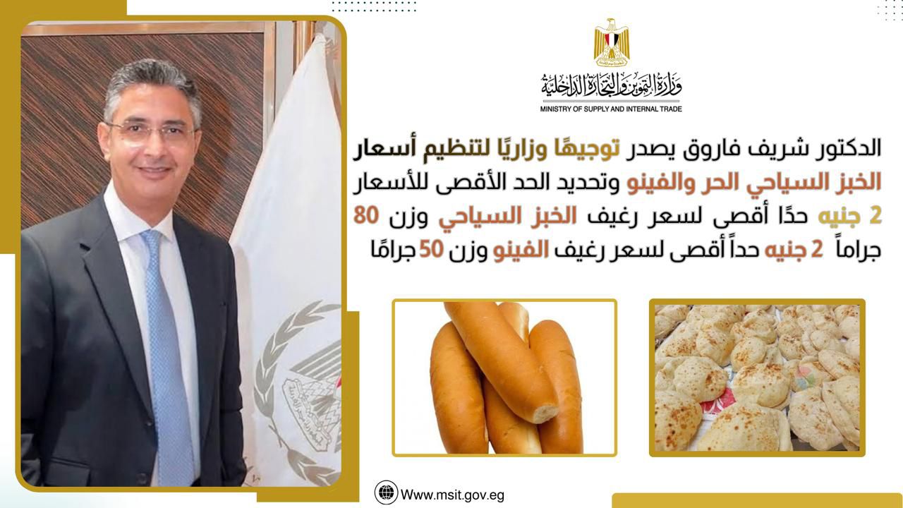 أصدر وزير التموين التوجيه الوزاري رقم 5 لسنة 2026 لتحديد الحد الأقصى لأسعار الخبز السياحي والخبز الفينو، بهدف ضبط الأسواق وحماية المستهلك.