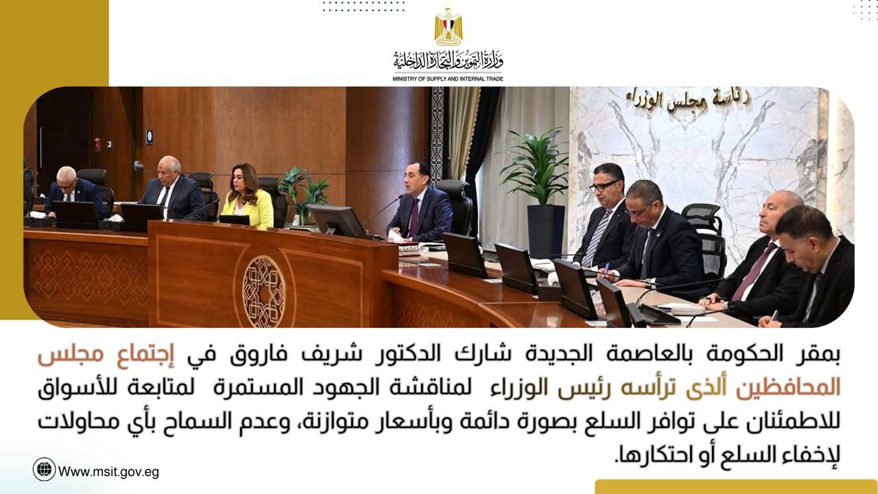 شارك الوزير في اجتماع مجلس المحافظين برئاسة رئيس الوزراء، والذي أكد خلاله ضرورة استمرار المتابعة الميدانية للأسواق لضمان توافر السلع الأساسية ومنع أي محاولات للاحتكار أو إخفاء السلع.