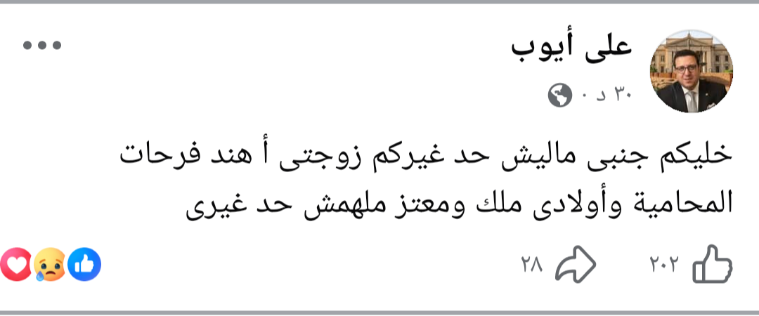 وكتب المحامي على أيوب على صفحته الشخصية على موقع التواصع الاجتماعي فيس بوك: «خليكم جنبي ماليش حد غيركم زوجتي هند فرحات فرحات المحامية وأولادي ملك ملهمش حد غيري».