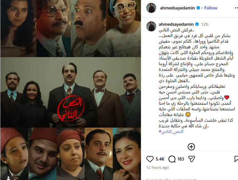 وأضاف: وطبعا شكر خاص للجمهور حبايبي على ردة الفعل الحلوة دي.تعليقاتكم، ورسايلكم واصلين ومفرحين قلبي، حتى اللي مستني أحسن حبه واصلني.. ودايما يارب اللي جي أحسن، أتمنى تكونوا استمتعتوا بالرحلة زي ما احنا استمتعنا بصناعتها..ولسه الحلقات اللي جاية مليانة مفاجآت، كدا تبقى خلصت السأسوءة، ونتقابل قريب إن شاء الله في حكاية جديدة.