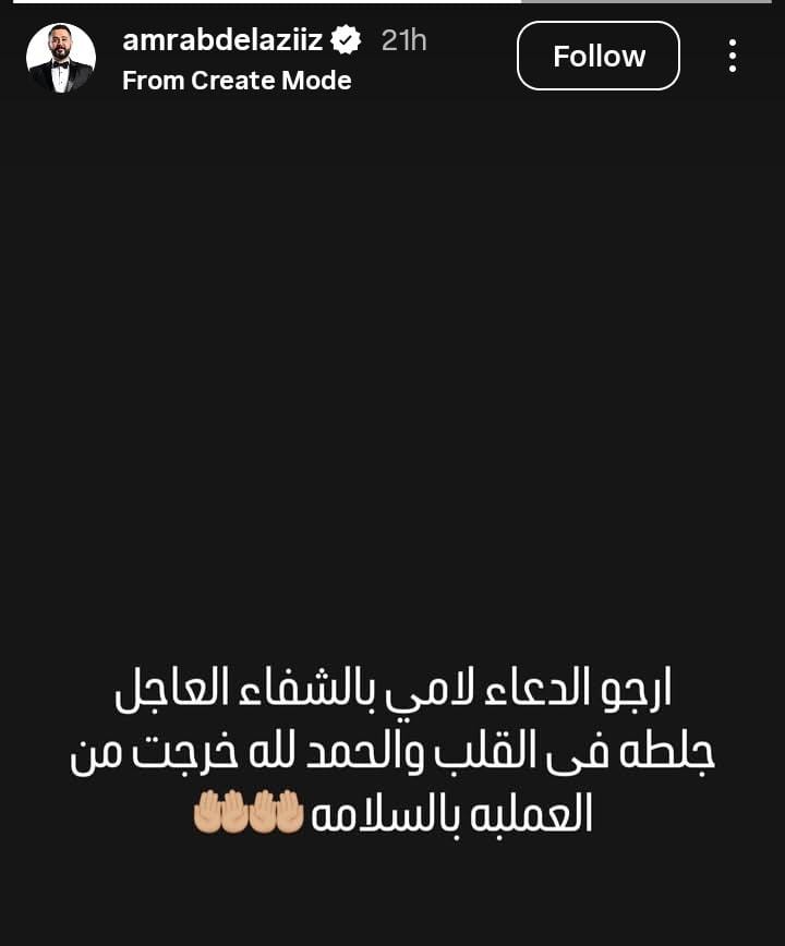 وكتب عمرو عبدالعزيز عبر حسابه الرسمي بموقع التواصل الاجتماعي “انستجرام”: ارجو الدعاء لأمي بالشفاء العاجل، جلطة في القلب، والحمدلله خرجت من العملية بالسلامة.