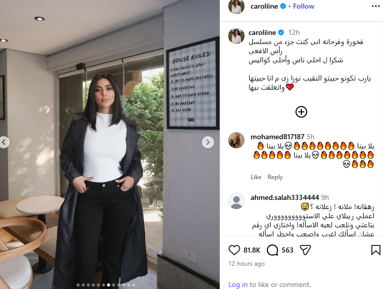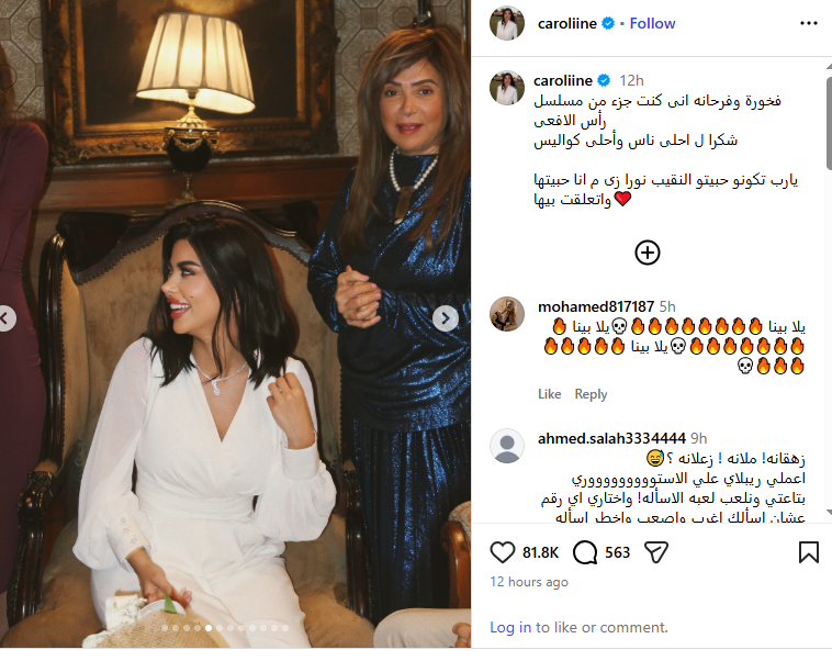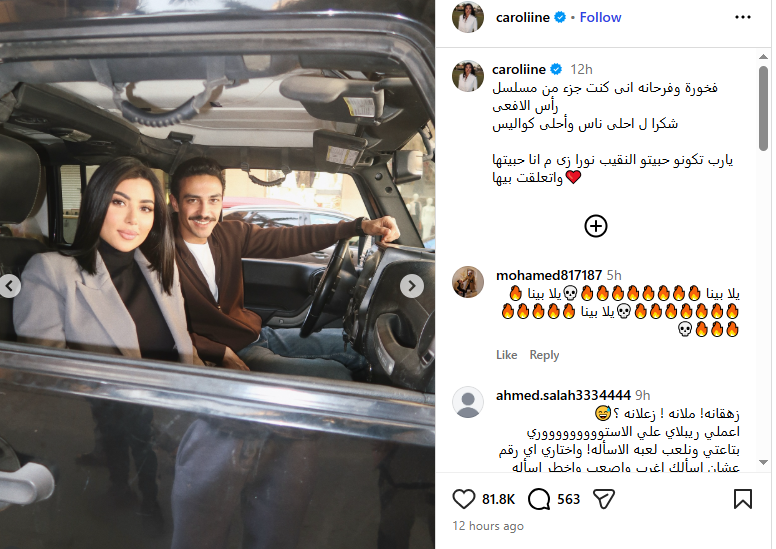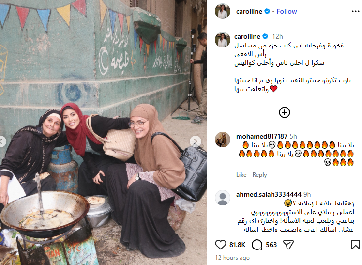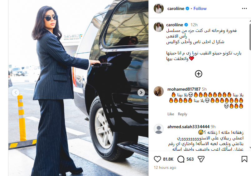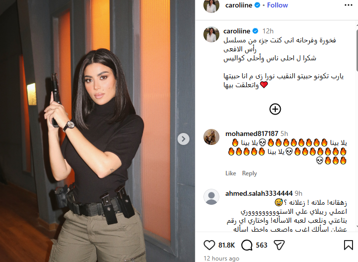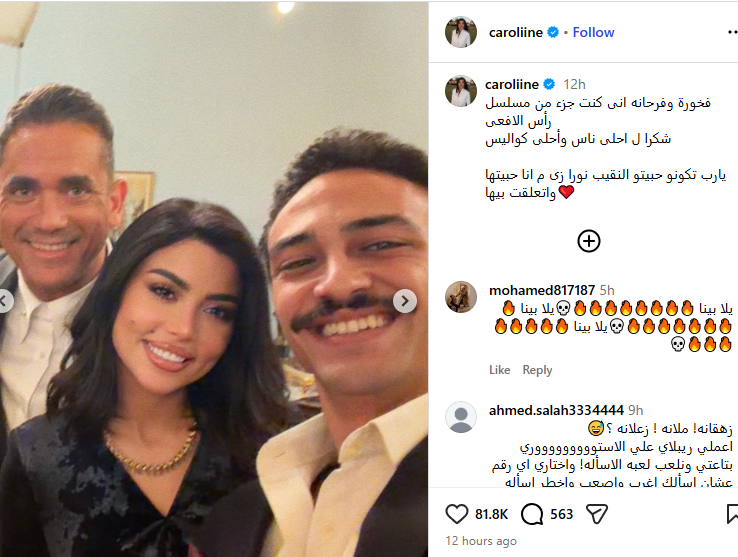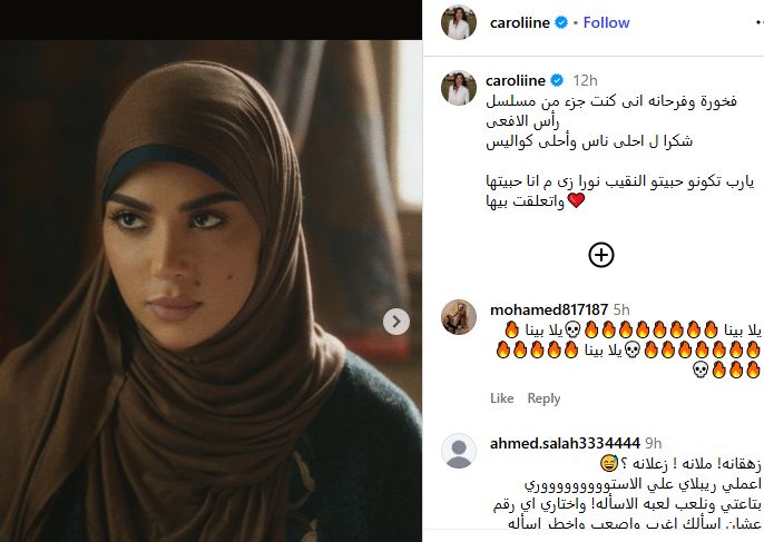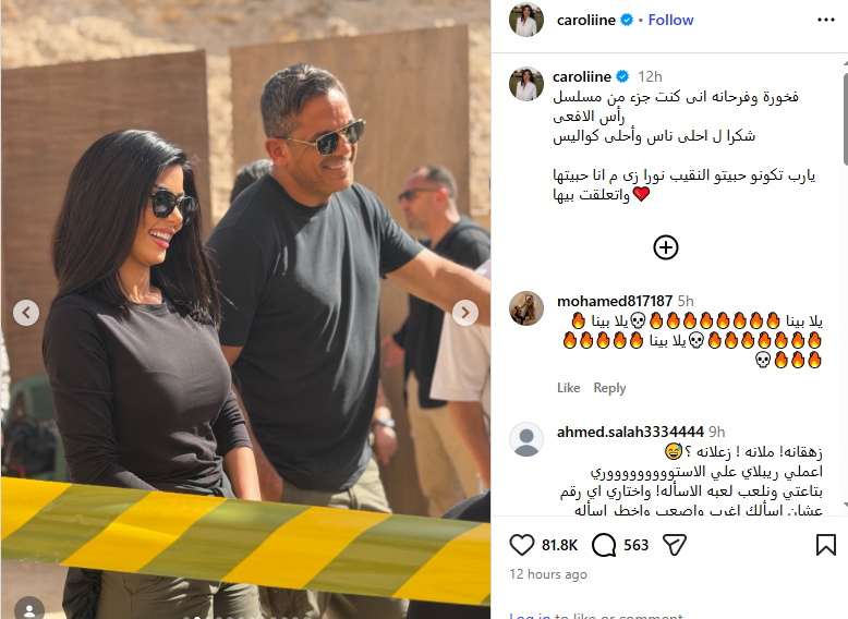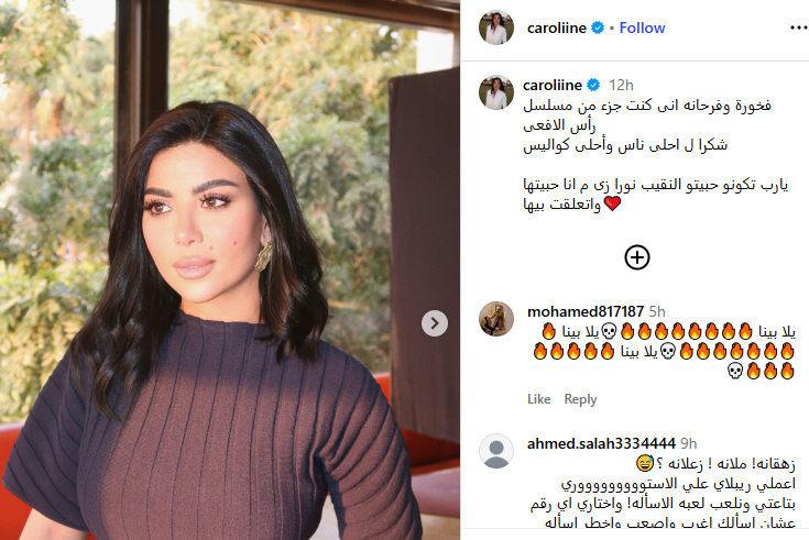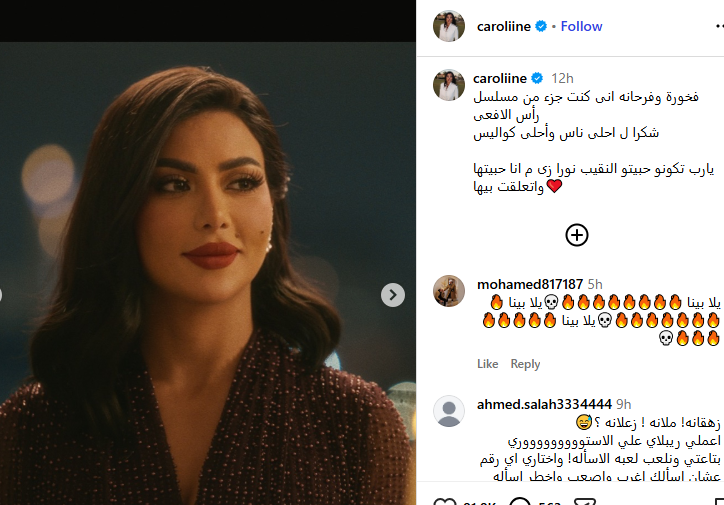 ونشرت كارولين عزمي صورا من كواليس التصوير، وذلك عبر حسابها الرسمي بموقع التواصل الاجتماعي “انستجرام”، وعلقت عليها قائلة: فخورة وفرحانه إنى كنت جزء من مسلسل رأس الأفعى، شكرا لـ أحلى ناس وأحلى كواليس، يارب تكونو حبيتو النقيب نورا زى ما أنا حبيتها واتعلقت بيها.
